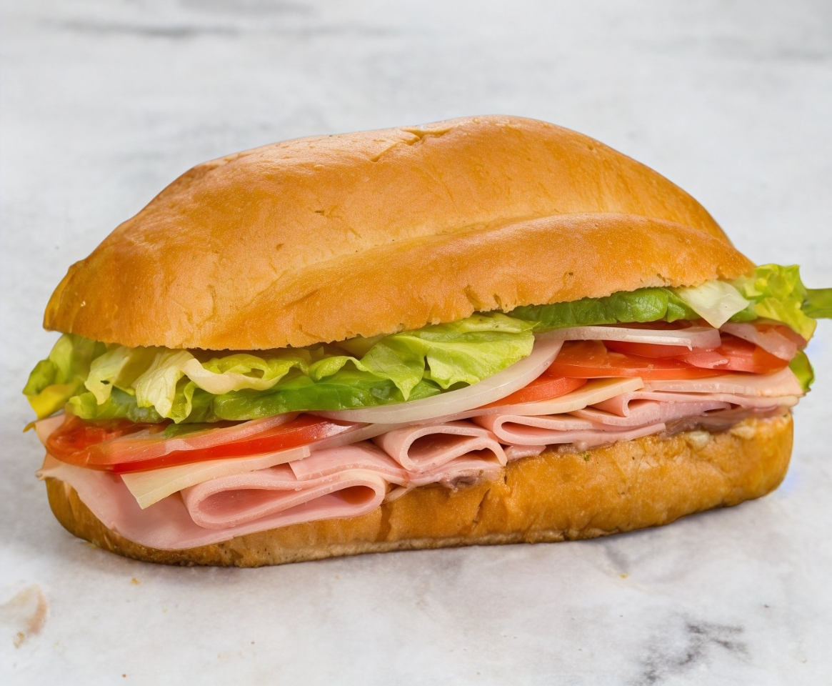 Jamón de pierna, queso aguacate, y verdura en pan de baguete.