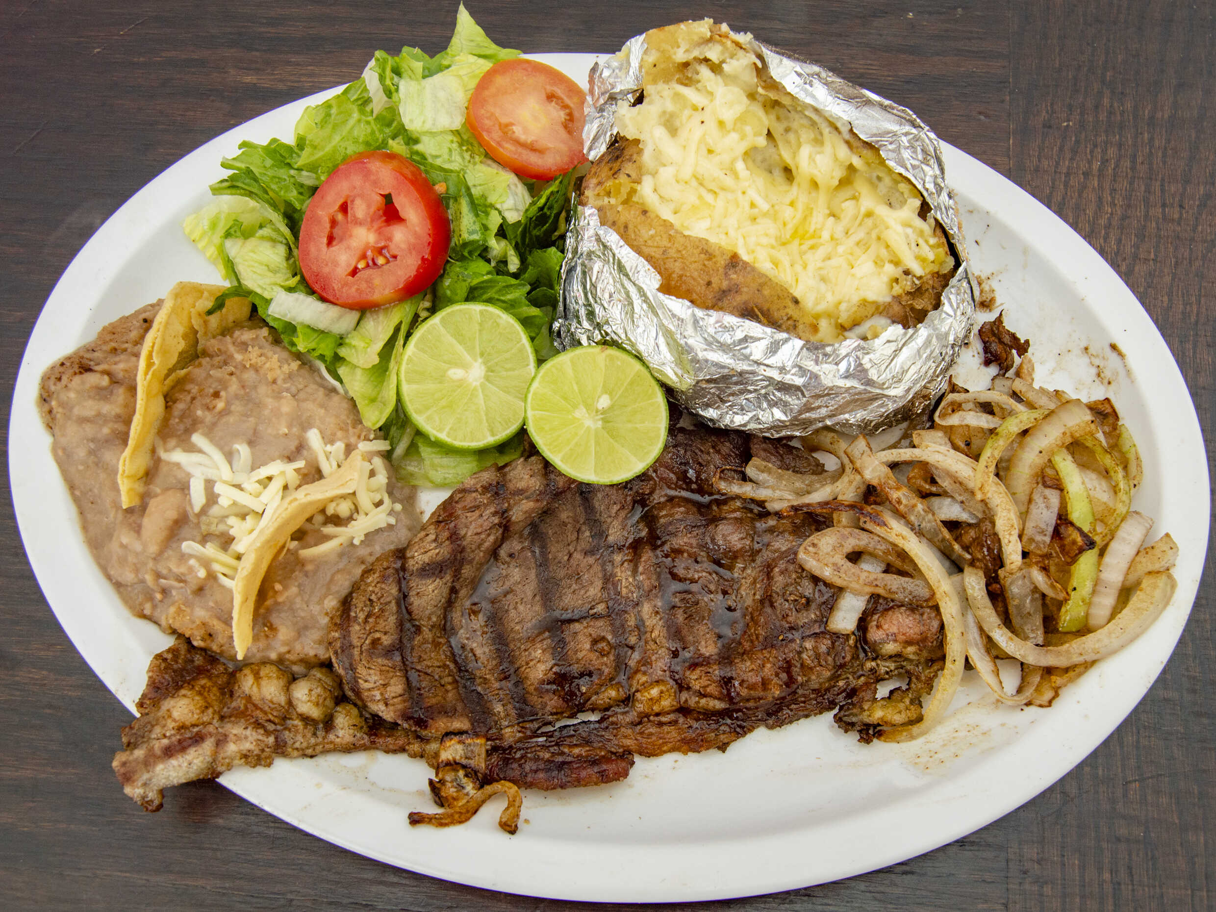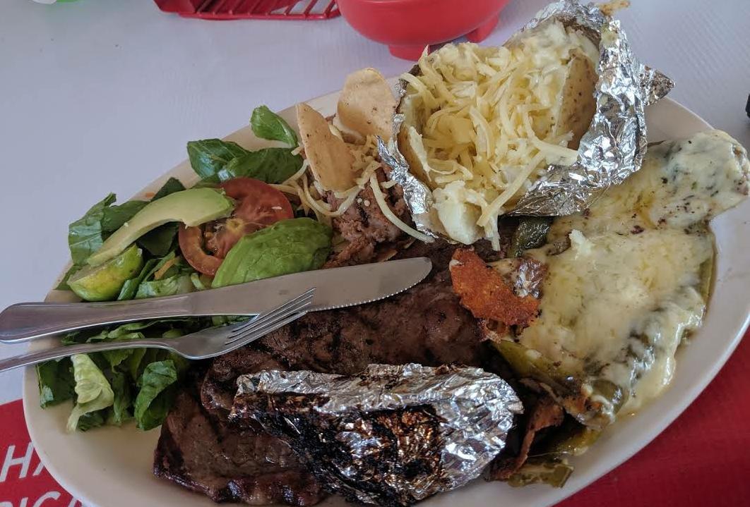 Carne Asada, elote, frijoles, lechuga, pimiento verde, aguacate, queso chihuahua y ranch.