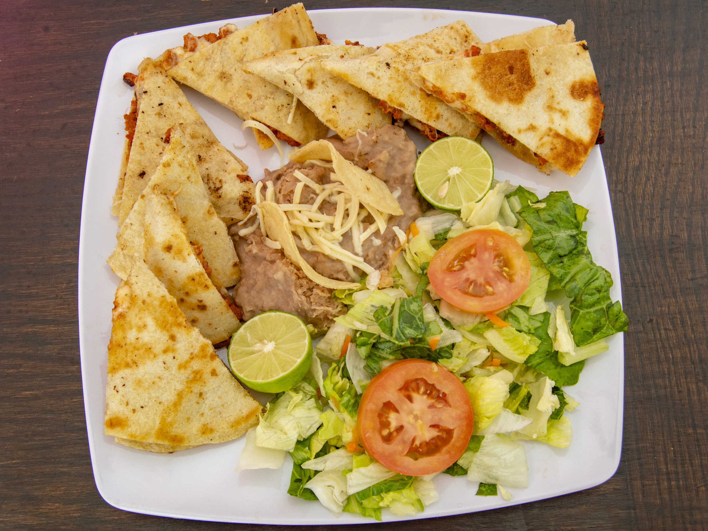 2 Tortillas, Queso chihuahua, frijoles refritos y Ensalada.