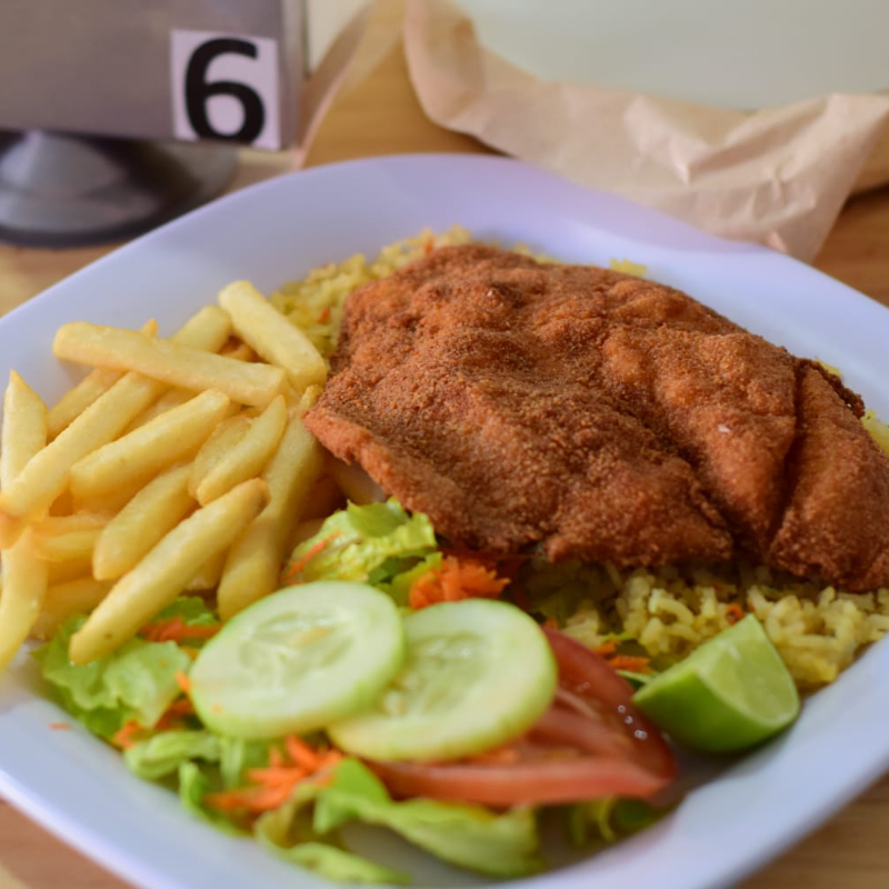 Filete de pescado empanizado o al mojo de ajo, arroz, ensalada y papas a la francesa.