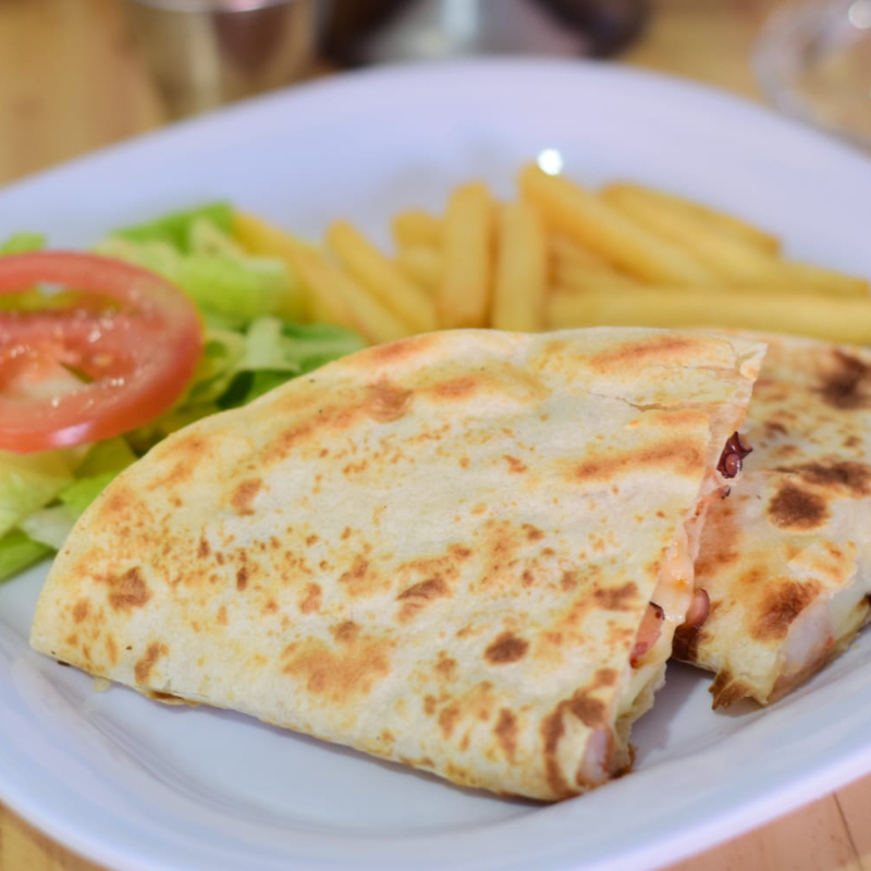 Rica quesadilla rellena de camarón salteado con el sazonador de la casa, papas fritas y ensalada verde.