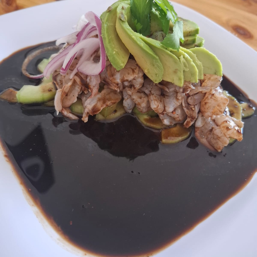 Acompañado de jugosos camarones, cebollita morada, cilantro, pepino, aguacate y la salsa de la casa