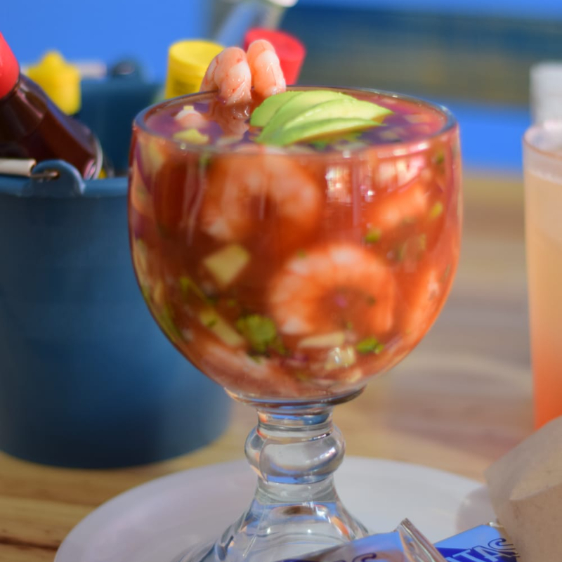 Camarones frescos en un preparado unico de pepino, chile, tomate y cebolla morada, en un jugo especial de la casa.