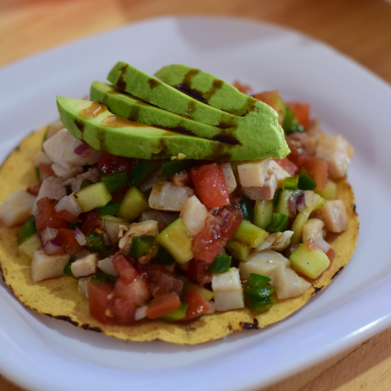 pescado blanco marinado en limon fresco con tomate, cebolla morada, cilantro y un toque picante.