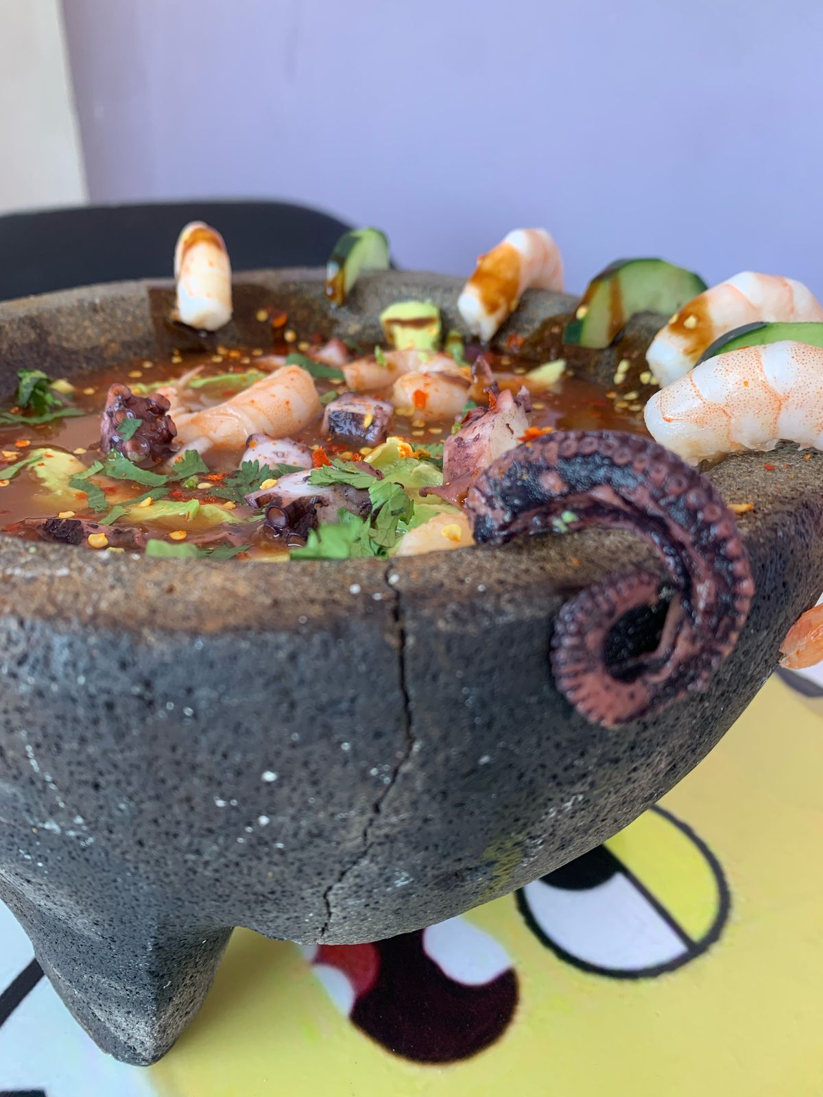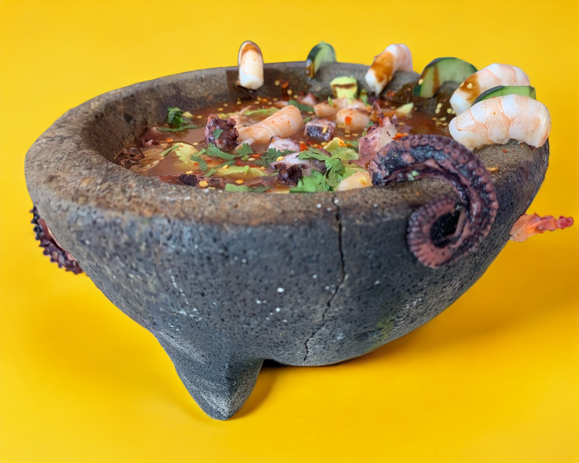 camaron mixto, pulpo Aguacate, cebolla, cilantro ,pepino