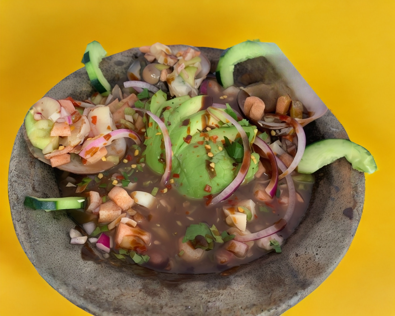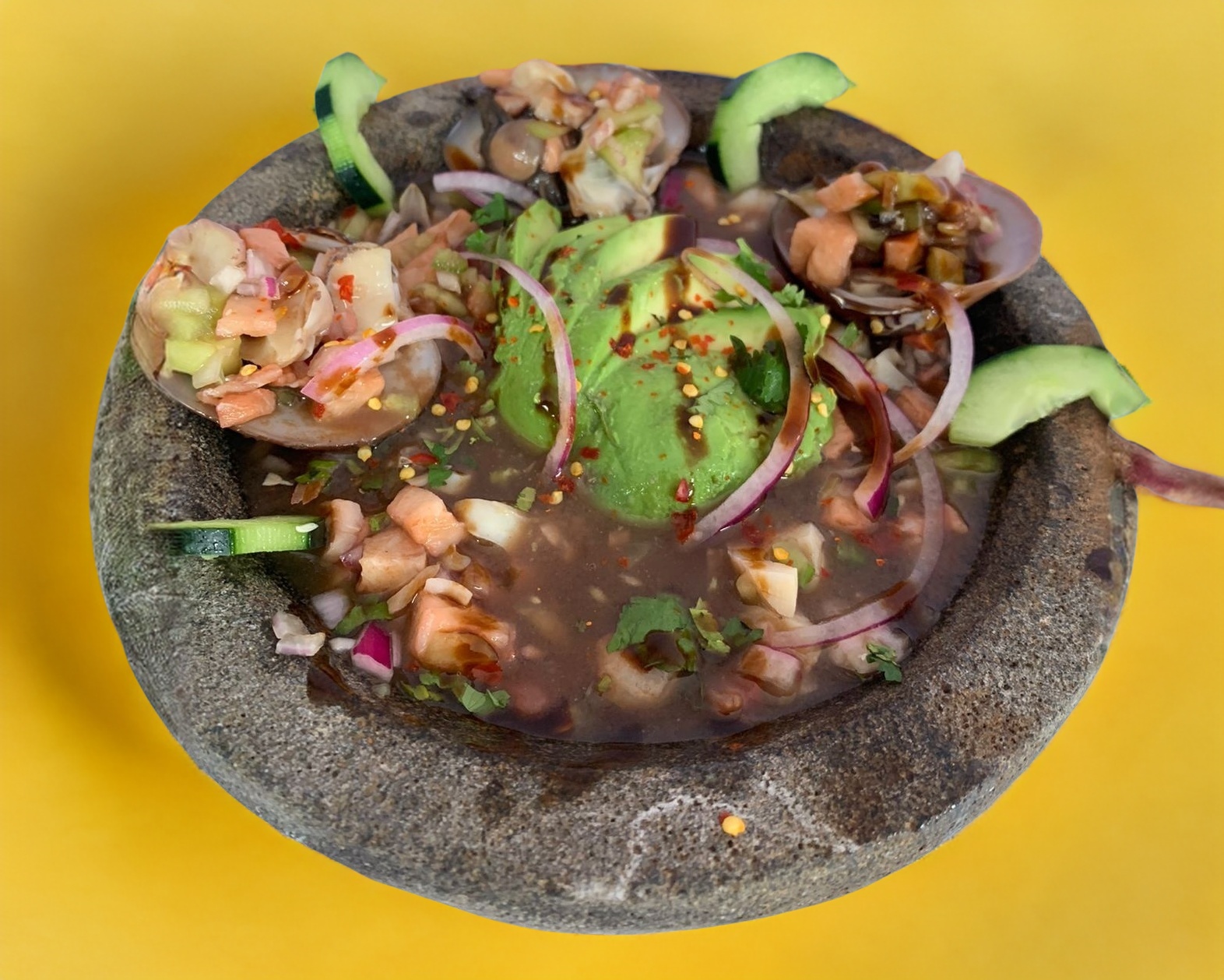 camaron mixto, pulpo, ostion, caracol, almeja chocolata Aguacate, cebolla, cilantro ,pepino