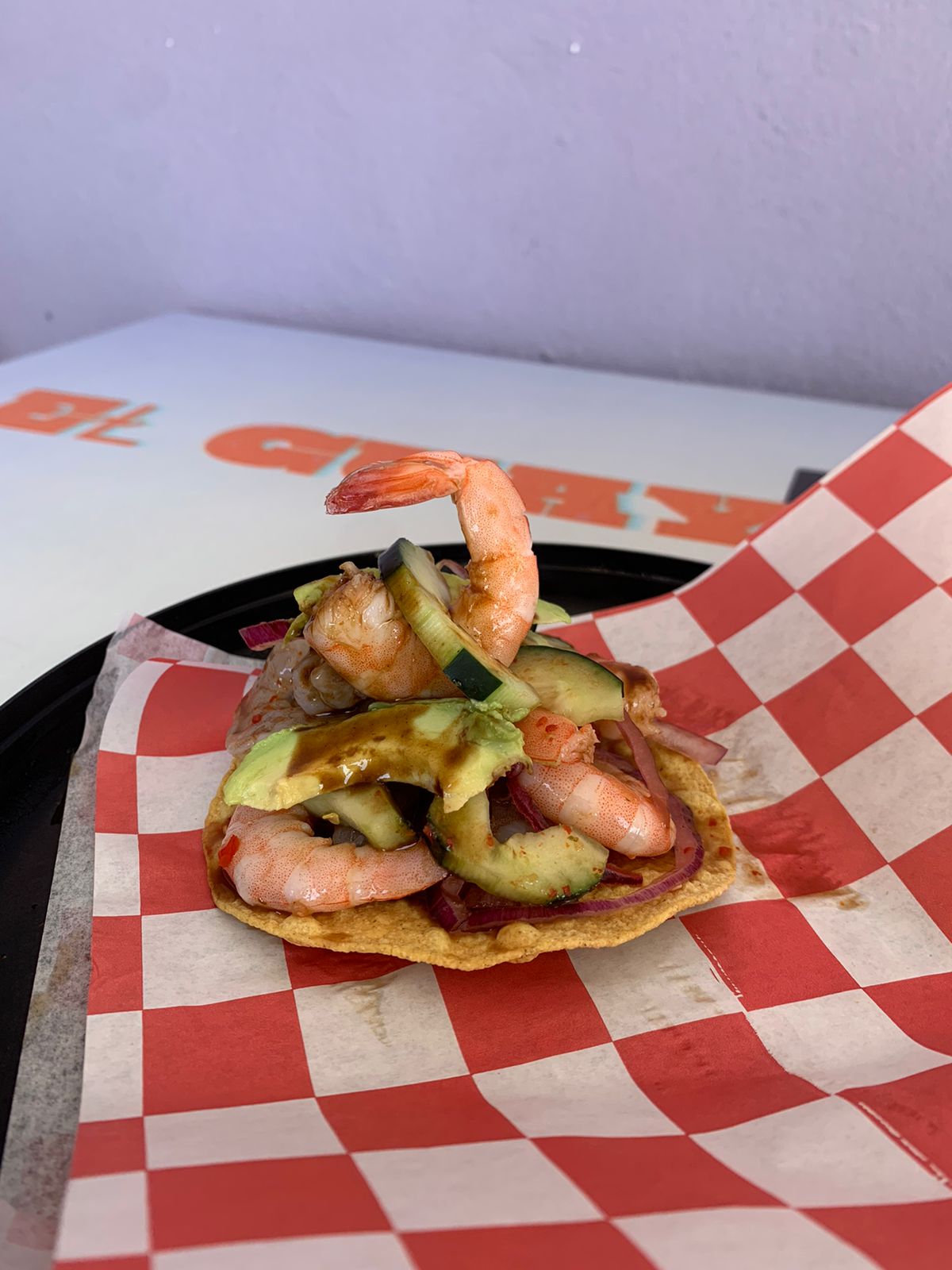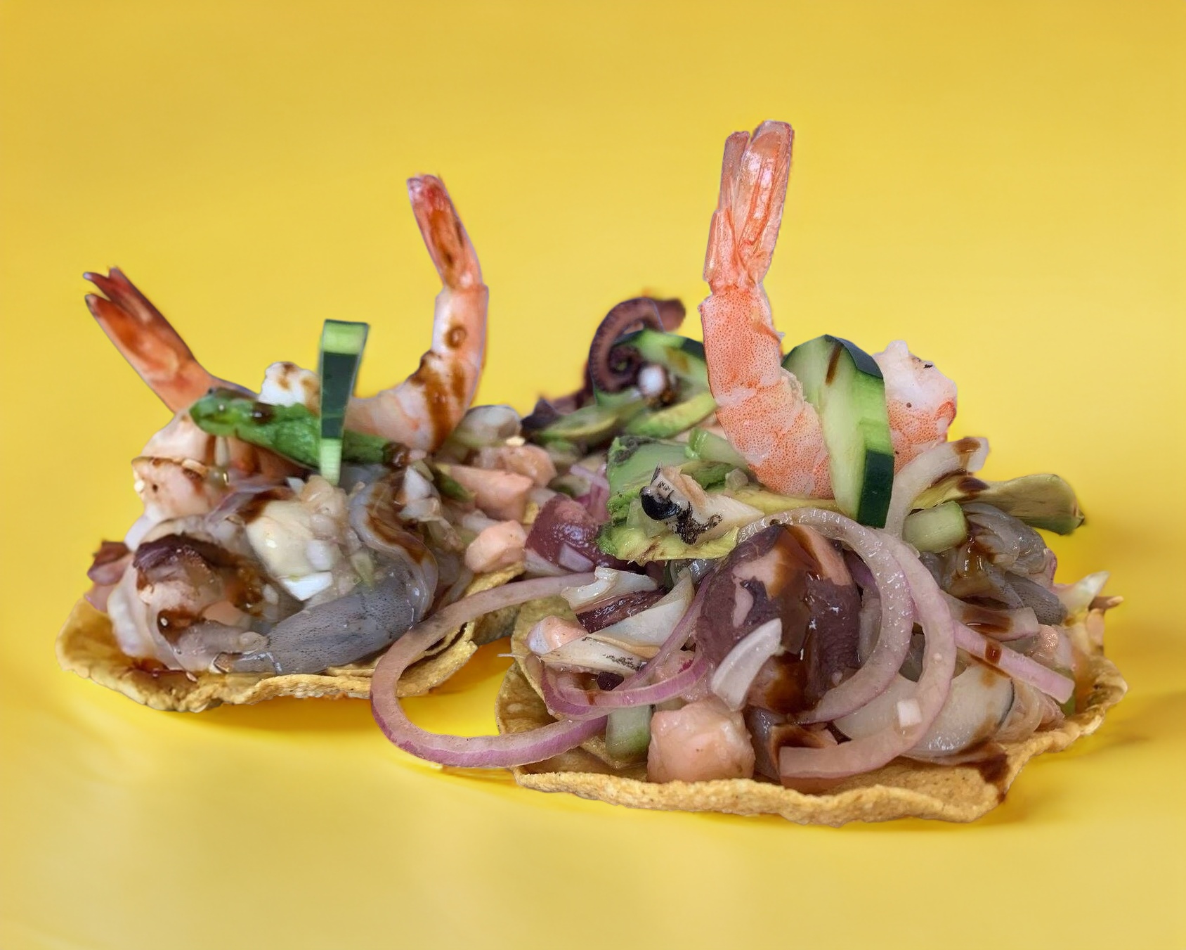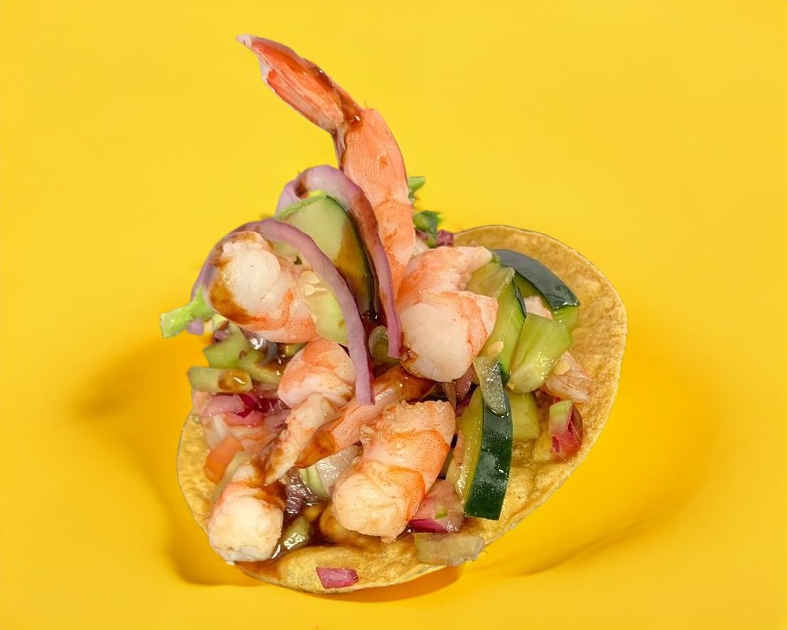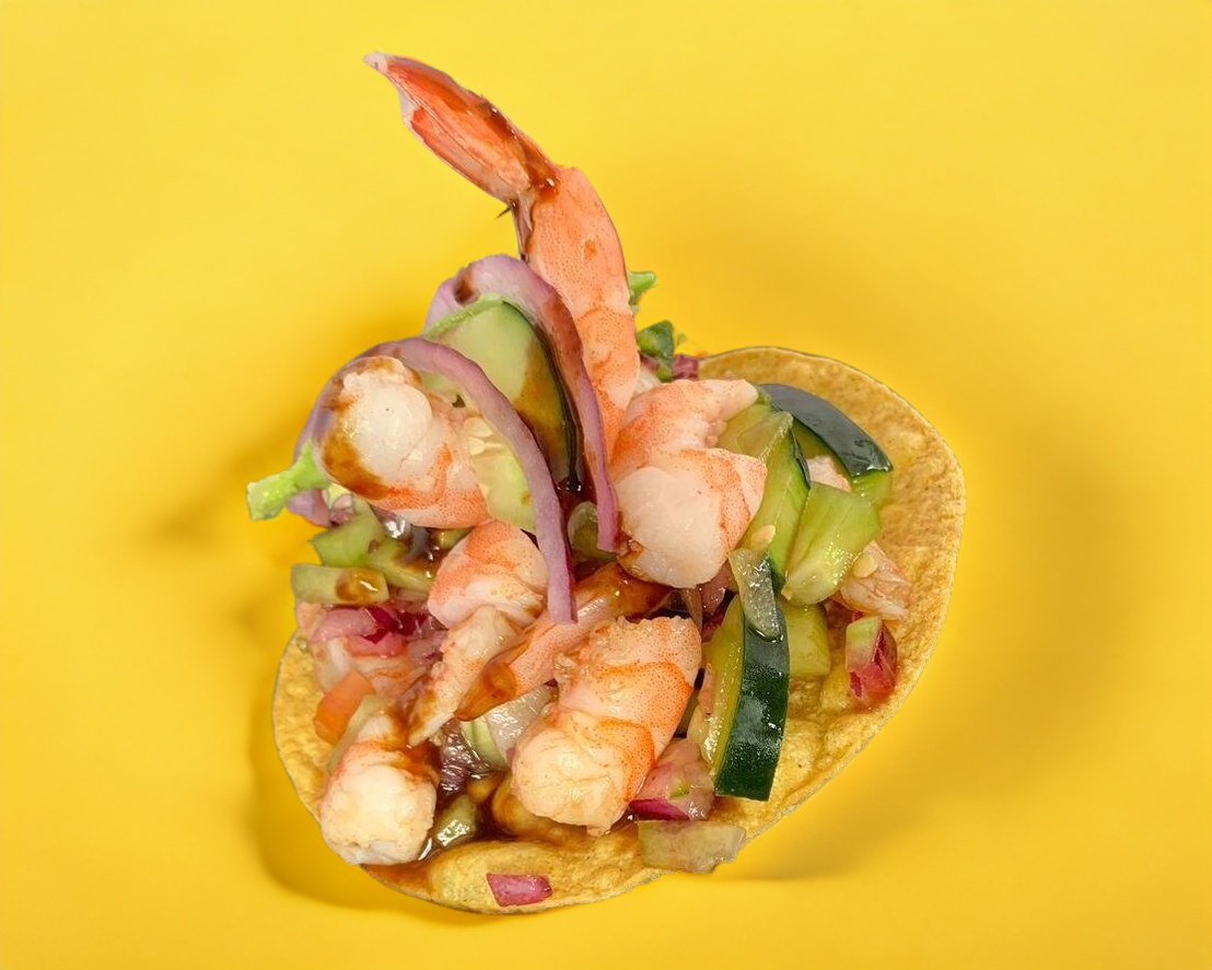 camaron a elegir crudo, cocido, mixto, preparados estilo aguachile coronados en una crujiente tostada, acompañados de cebolla, aguacate, cilantro y pepino