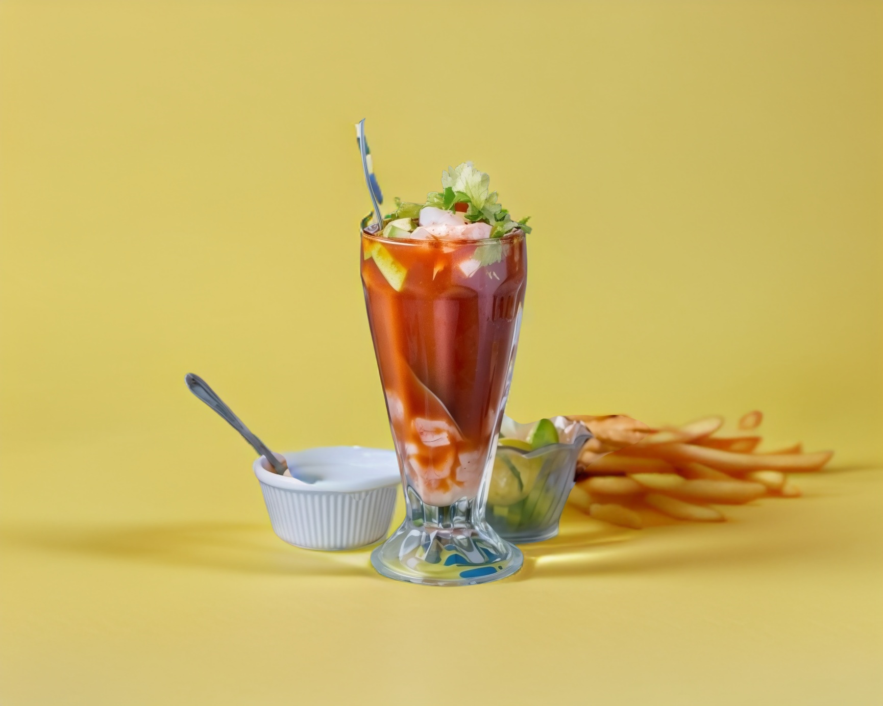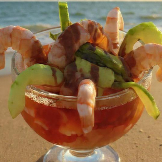 camaron picado en cubitos preparado estilo ceviche curtido en limon y acompañado de pepino, apio,pico de gallo,cebolla,aguacate,cilantro y marinado con salsas de la casa y clamato.