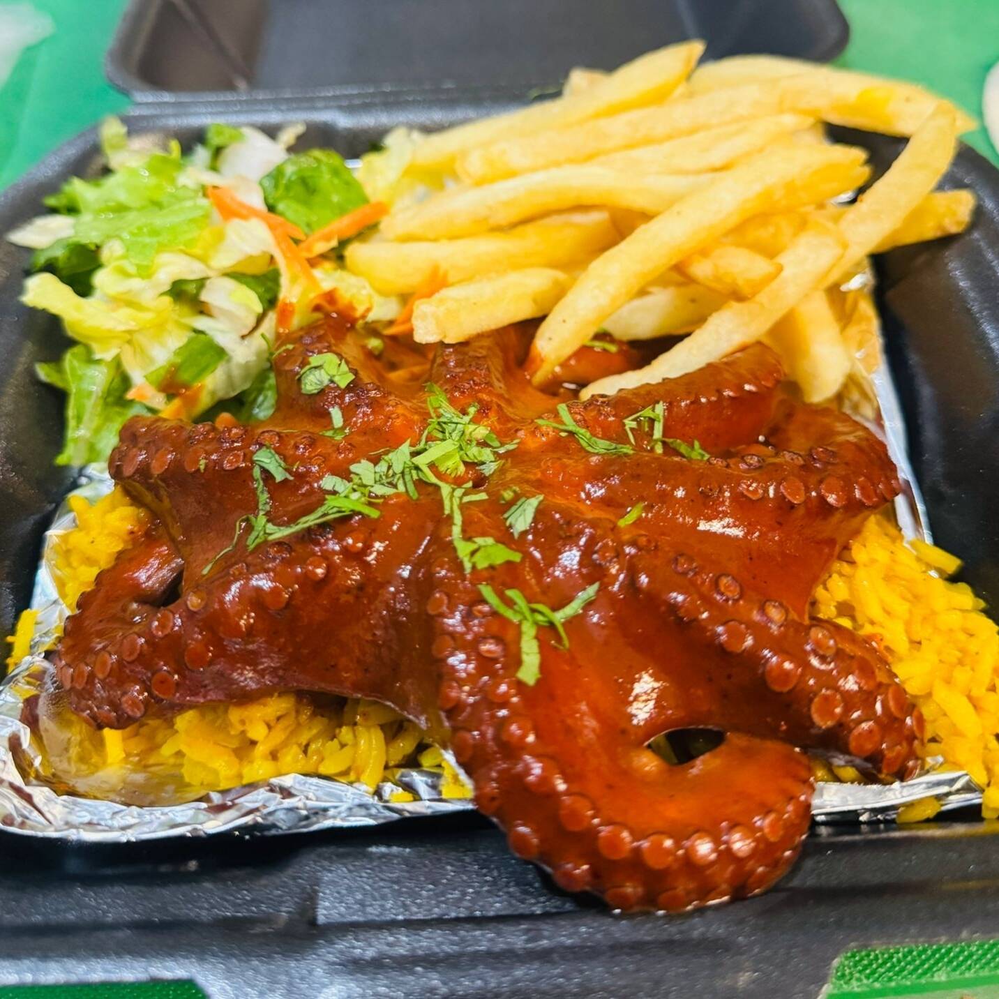 Pulpo en trozos salteado con ajo dorado y chile seco en mantequilla, servido con arroz y papas a la francesa.