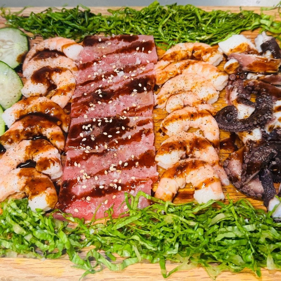 Charola con un mix de mariscos (camarón, pulpo, atún), bañados en salsa de la casa, у chiltepín, ideal para compartir y abrir apetito.