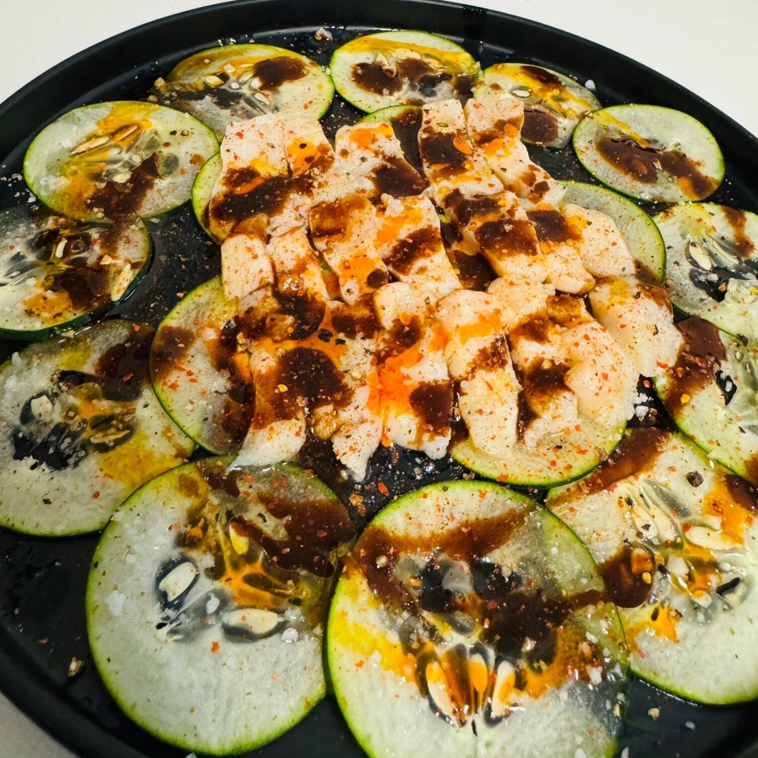 Camarón crudo y/o cocido bañado en salsa de chiltepín, con jugo de limón, ajo y especias del norte. Servido con pepino y cebolla morada.