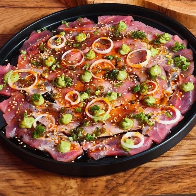 Atún fresco en láminas marinado en salsas negras, sobre una base de crema chipotle, aguacate y cebolla crujiente.
