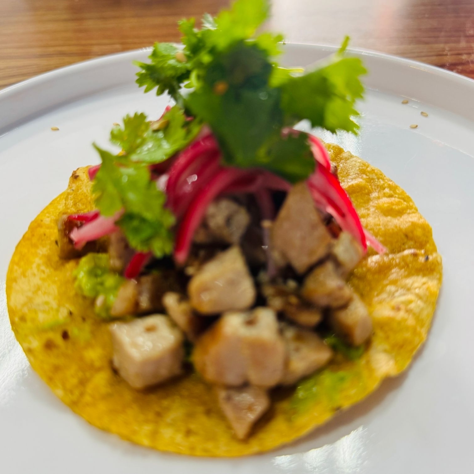 Atún sellado estilo tataki con costra de especias, montado en tortilla de harina con aguacate, cebolla morada encurtida y alioli de cilantro limón.