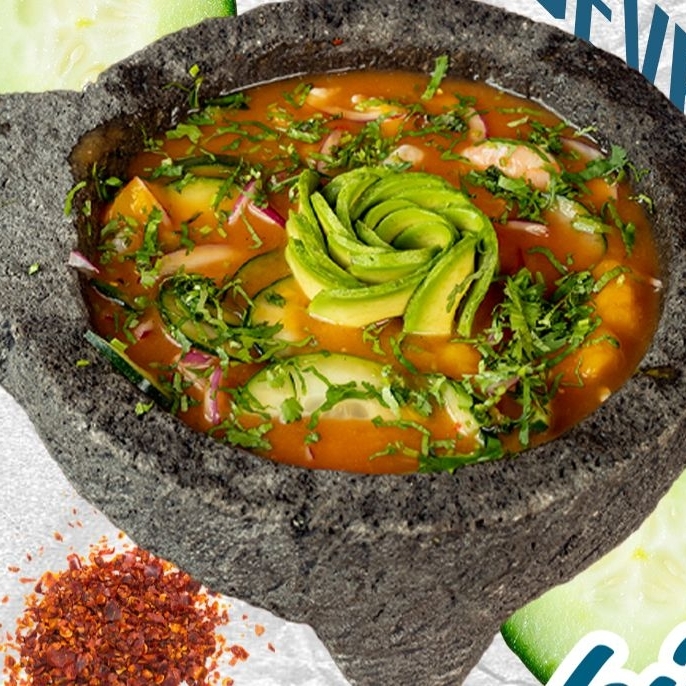 Preparado con camarón crudo y/o cocido marinado en mezcla de limón, soya, ajo, cebolla. Acompañado de pepino, aguacate y cebolla morada.