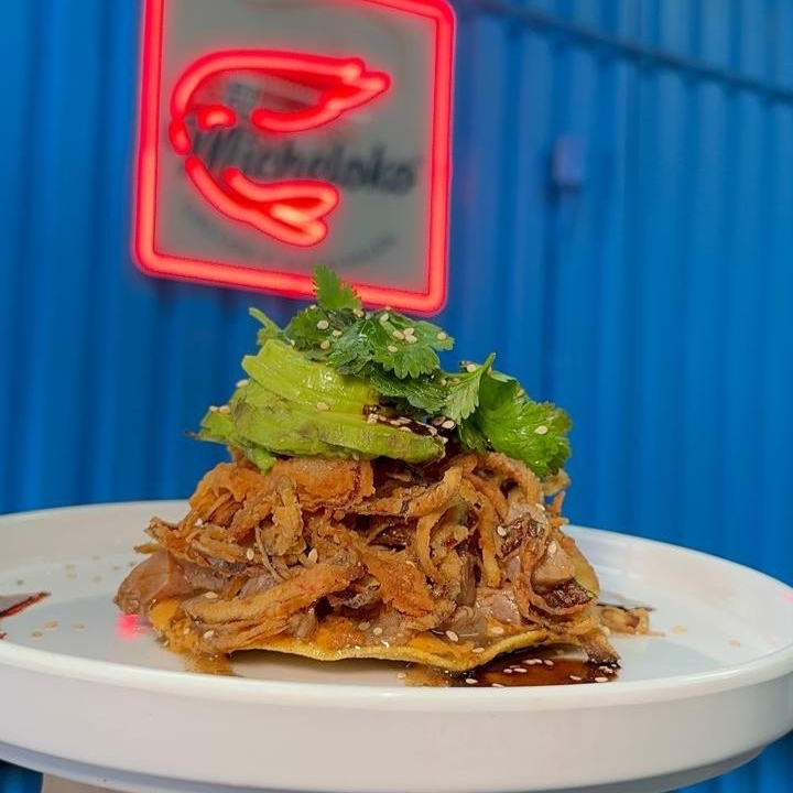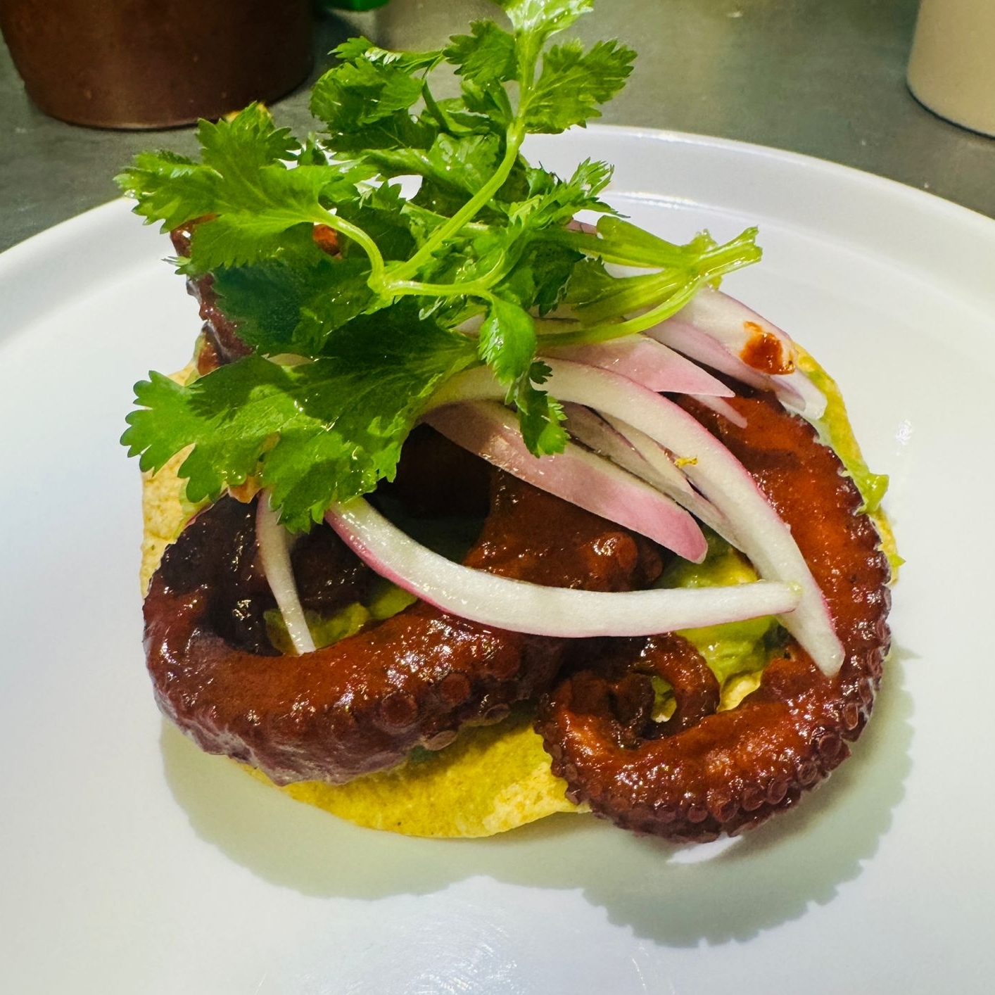 Pulpo tierno a la parrilla, acompañado de puré de aguacate, pico de gallo y un toque de aceite de chile guajillo.