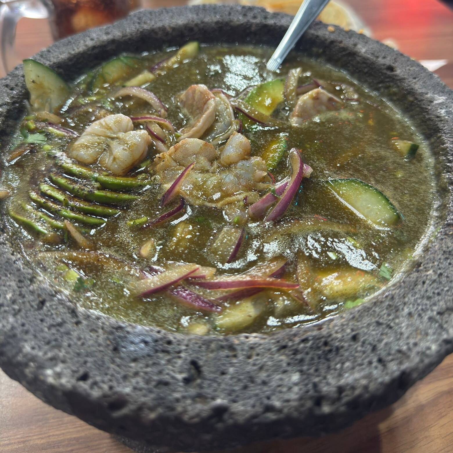 Callo de hacha fresco marinado en limón, con pepino, cebolla morada, cilantro y salsa especial estilo Mazatlán con toque de chiltepín.