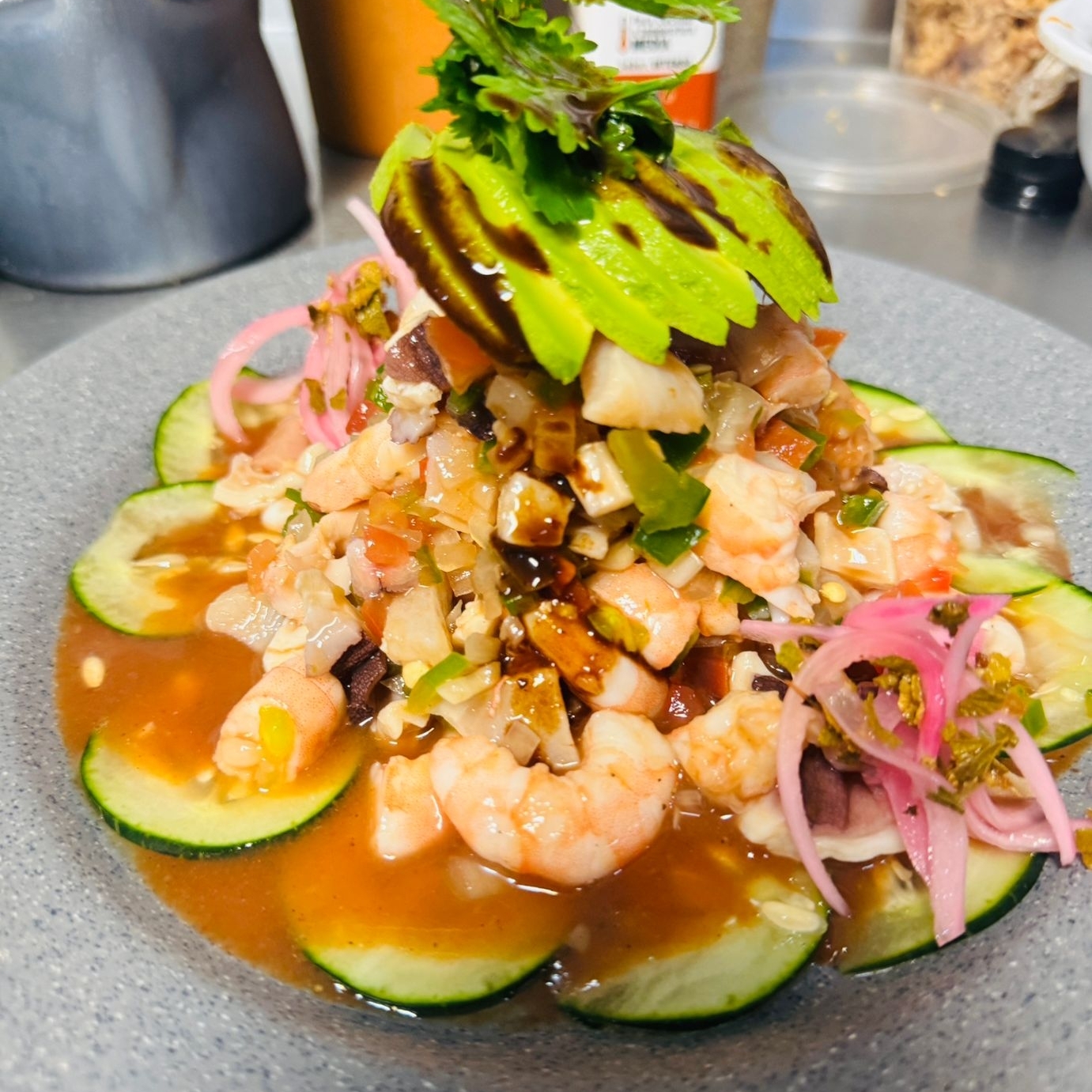 Pescado fresco, camarón cocido y pulpo fresco, acompañado de chile, tomate, cebolla morada, aguacate y bañado sobre una salsa de tomate especial.