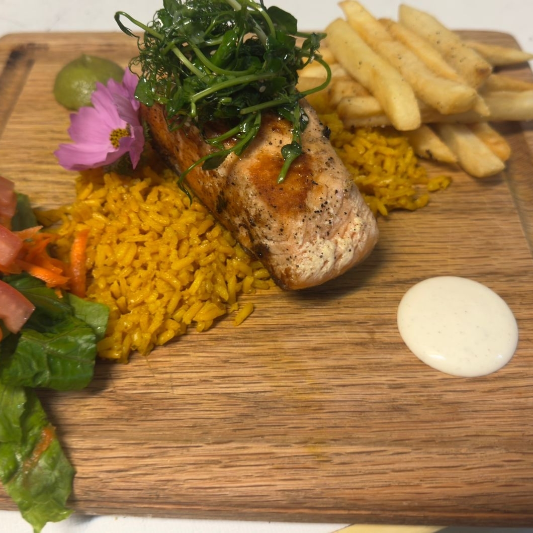 Lomo de salmón fresco marinado en adobo de la casa, cocinado a la plancha para lograr una textura jugosa con notas ahumadas.