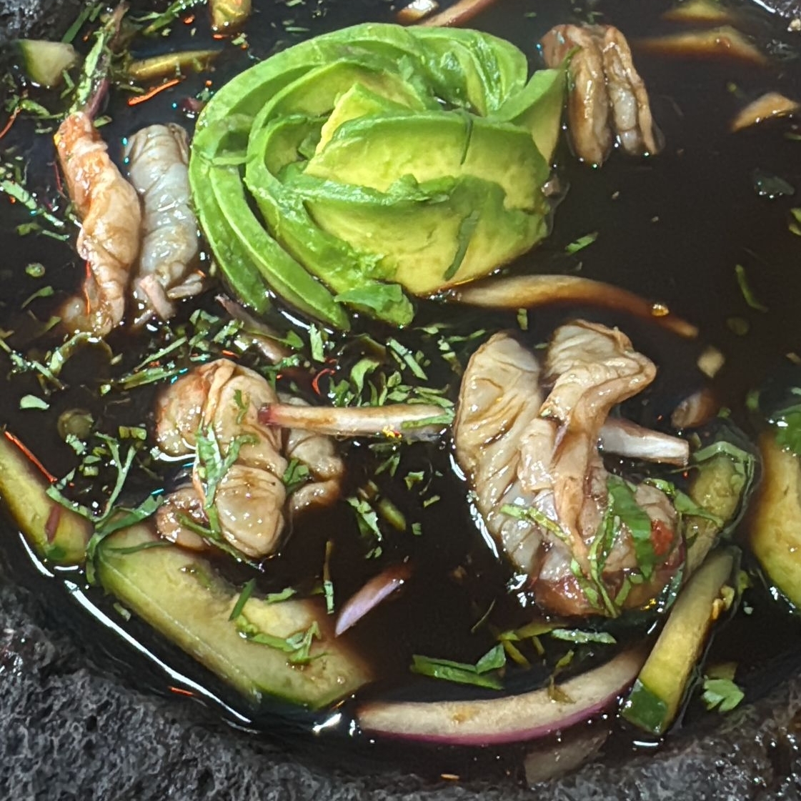 Camarón crudo marinado en limón y salsa de soya con ajo, cebolla, salsa inglesa, aceite de ajonjolí y chile serrano. Servido sobre tostada con aguacate.