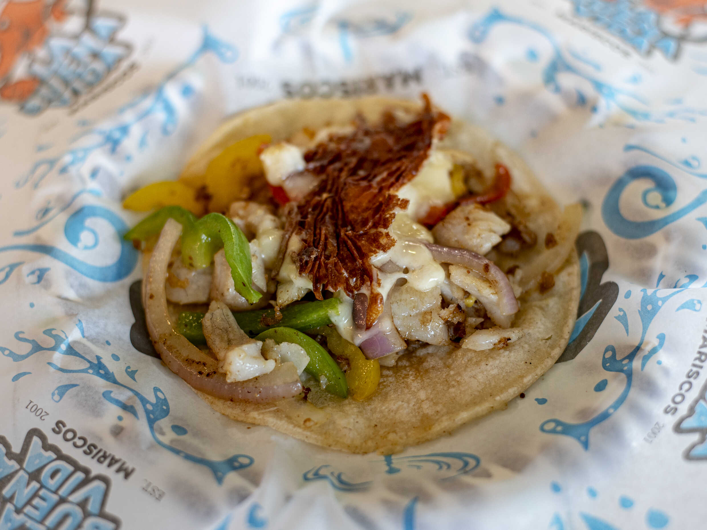 Pieza de taco de marlín, con chile morrón, cebolla y una costra de queso, acompañado de aderezo chipotle. *En la compra de 3 tacos o más, te incluimos papas francesas y un caldo de cortesía*