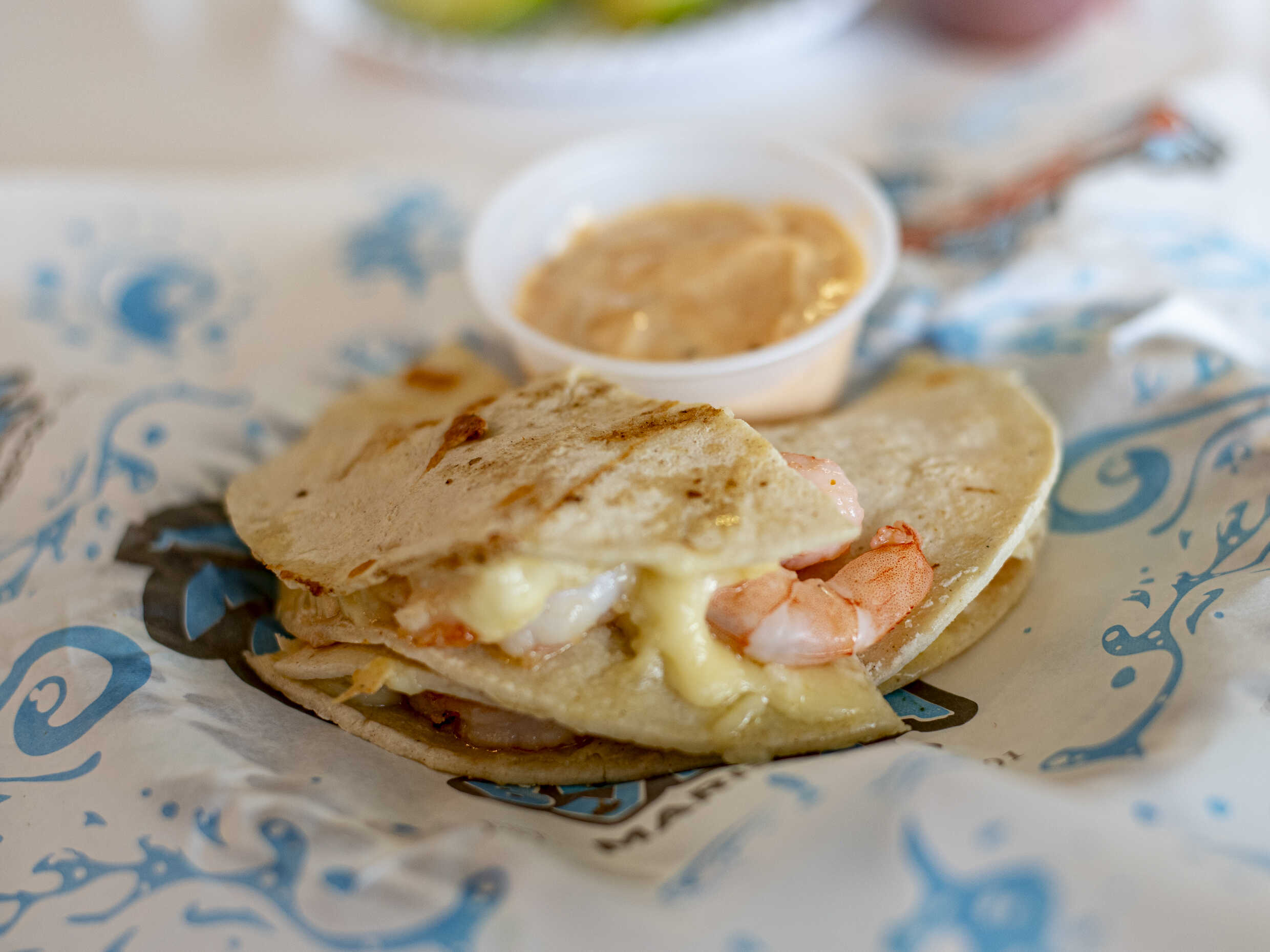Quesadilla de camarón con queso fundido, acompañado de aderezo de chipotle.