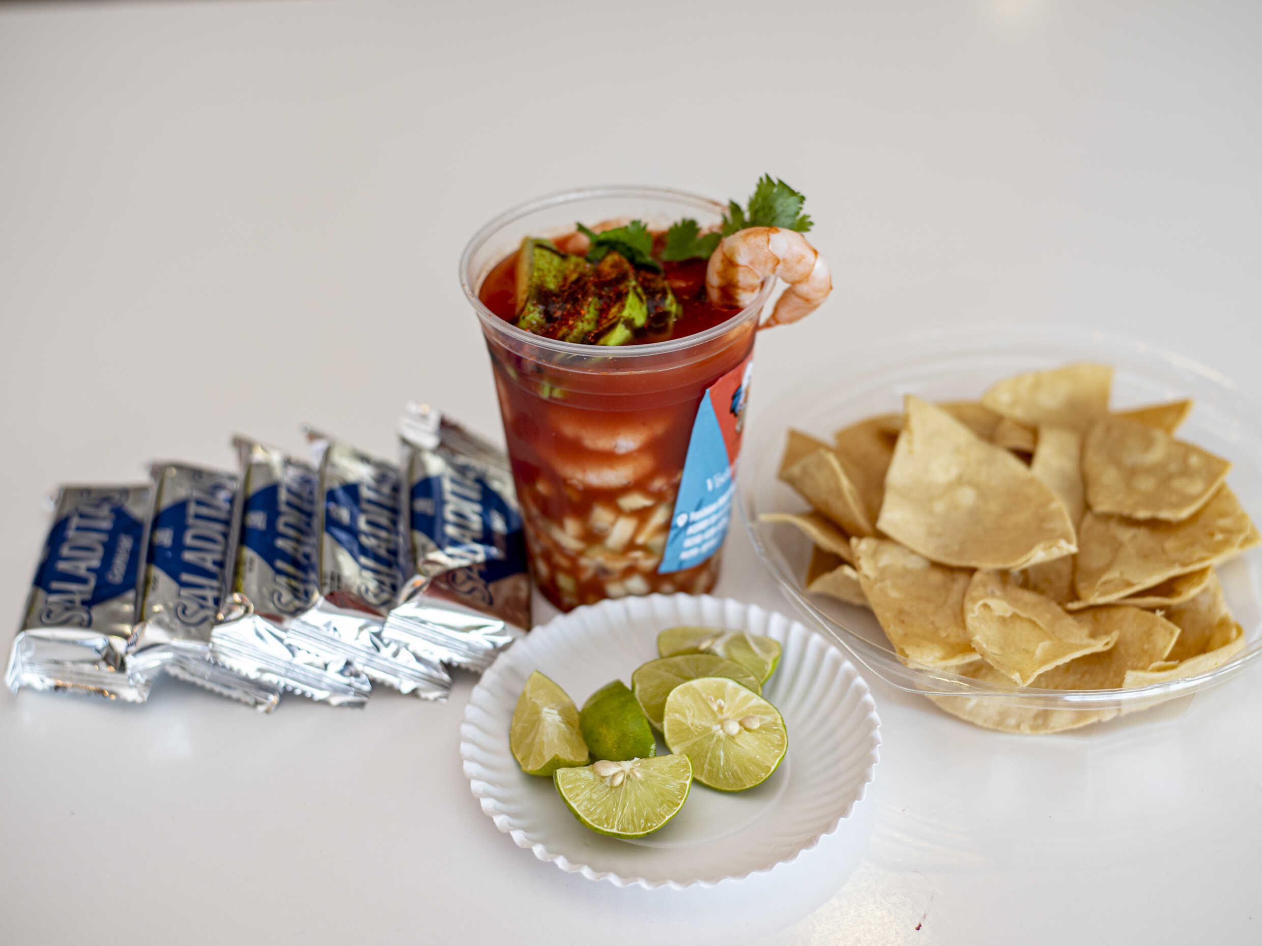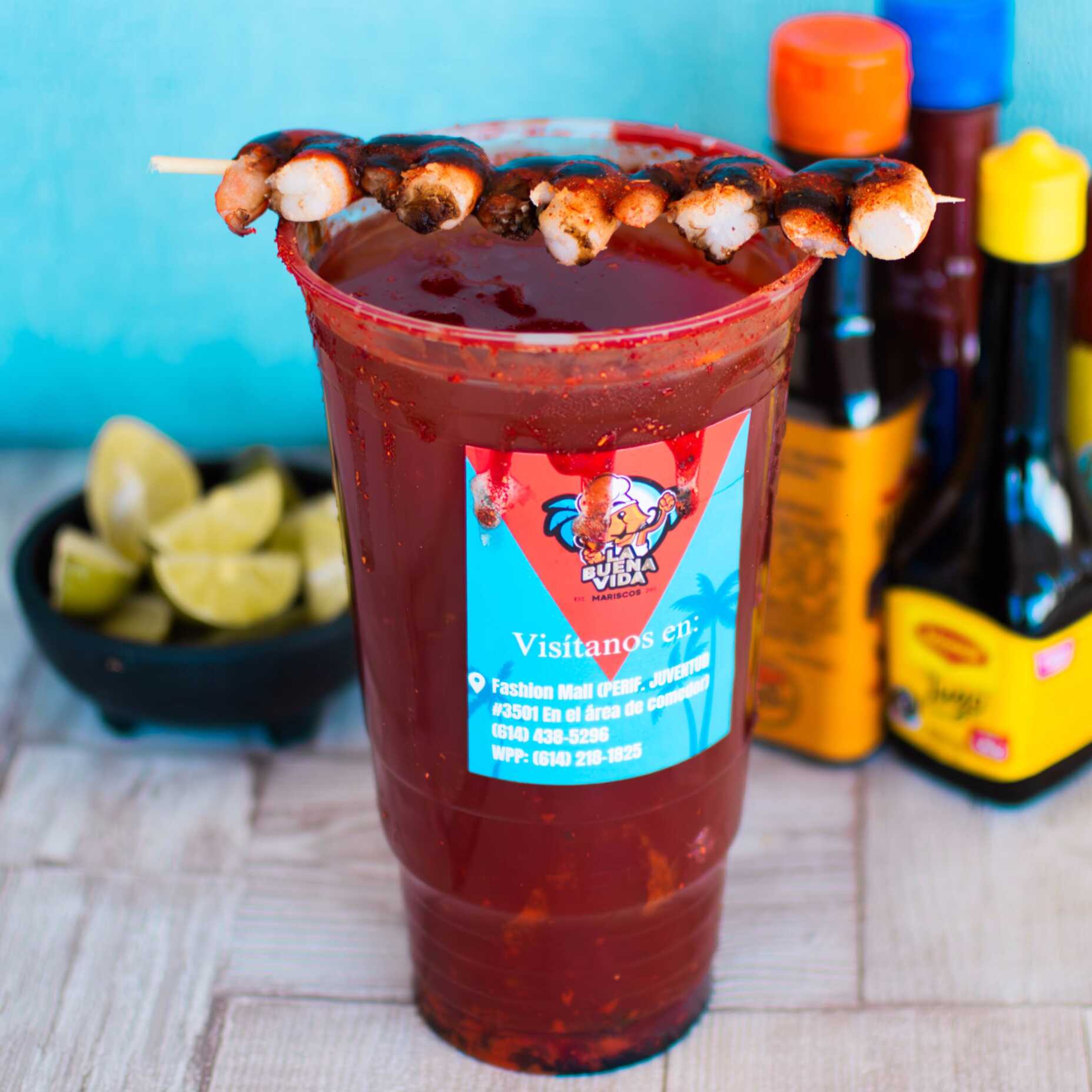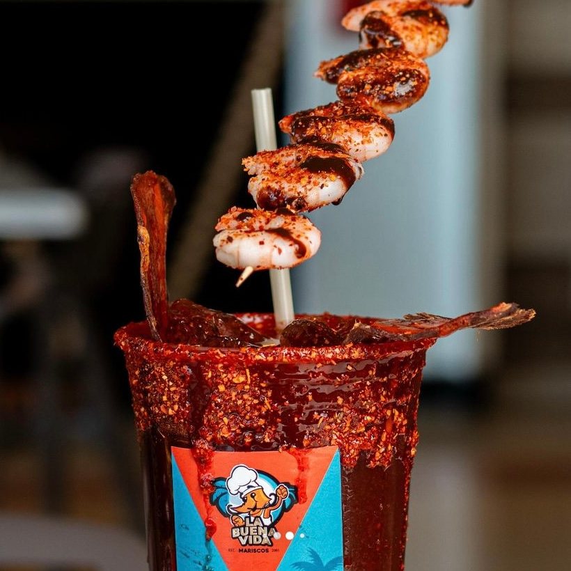1lt de clamato preparado con salsas negras, escarchado con Tajín, acompañado de una brocheta con 5 camarones y carne seca.