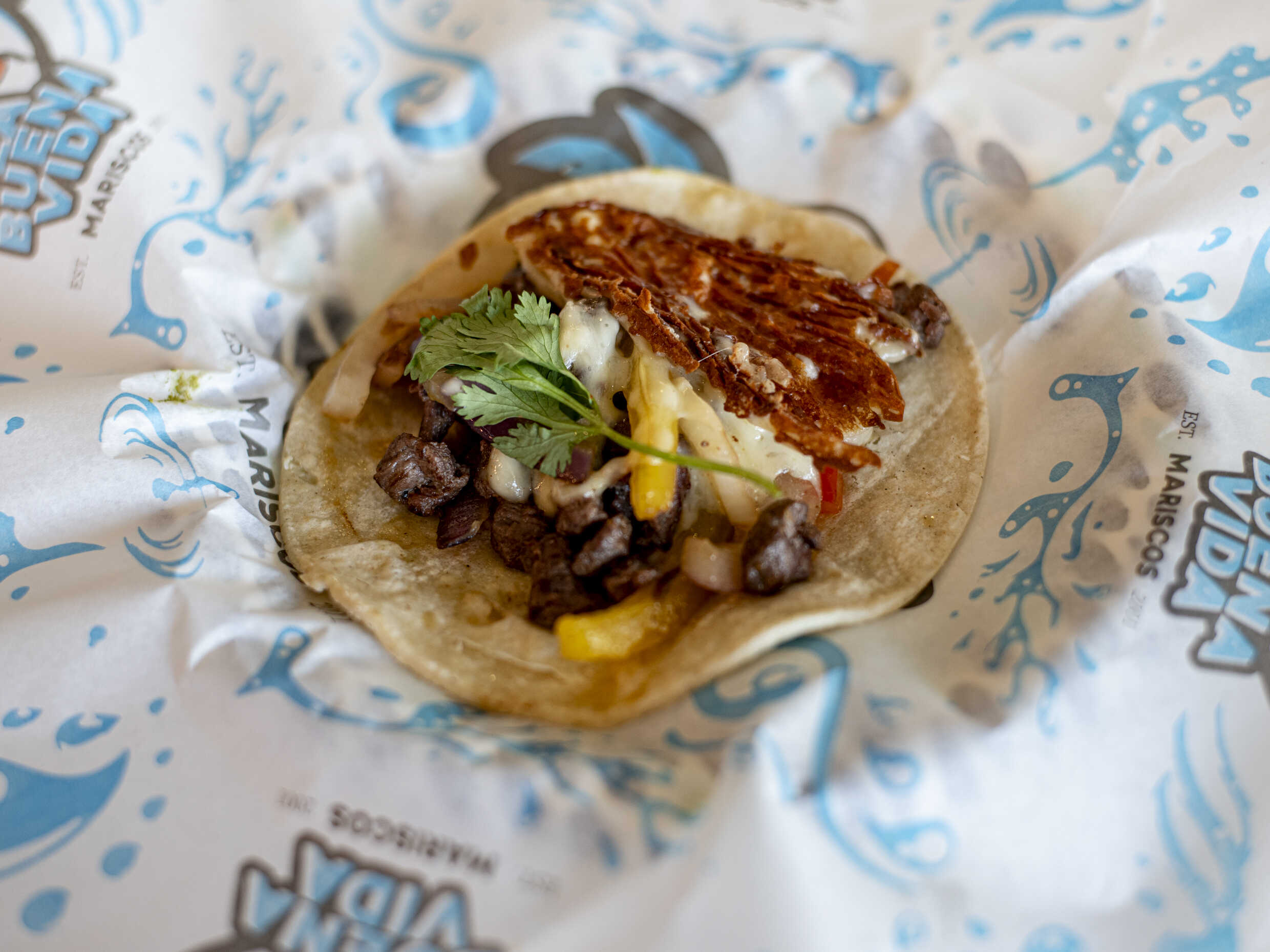 Pieza de taco de camarón y arrachera, con chile morrón, cebolla y una costra de queso, acompañado de aderezo chipotle. *En la compra de 3 tacos o más, te incluimos papas francesas y un caldo de cortesía*