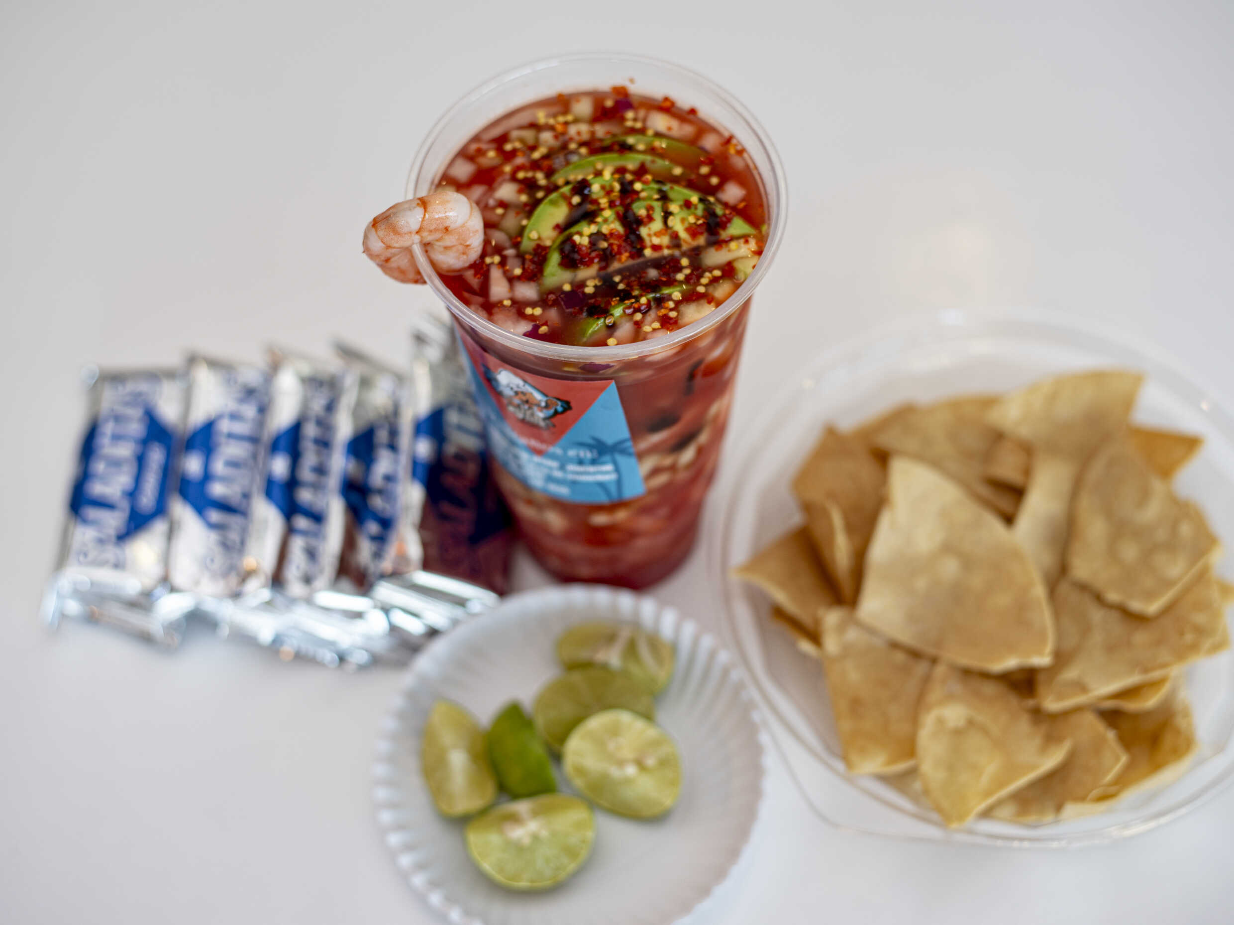 (500 ml) de caldo acompañado de 120 grs de camarón cocido en mariposa, zanahoria, apio, jalapeño y un toque de cilantro.