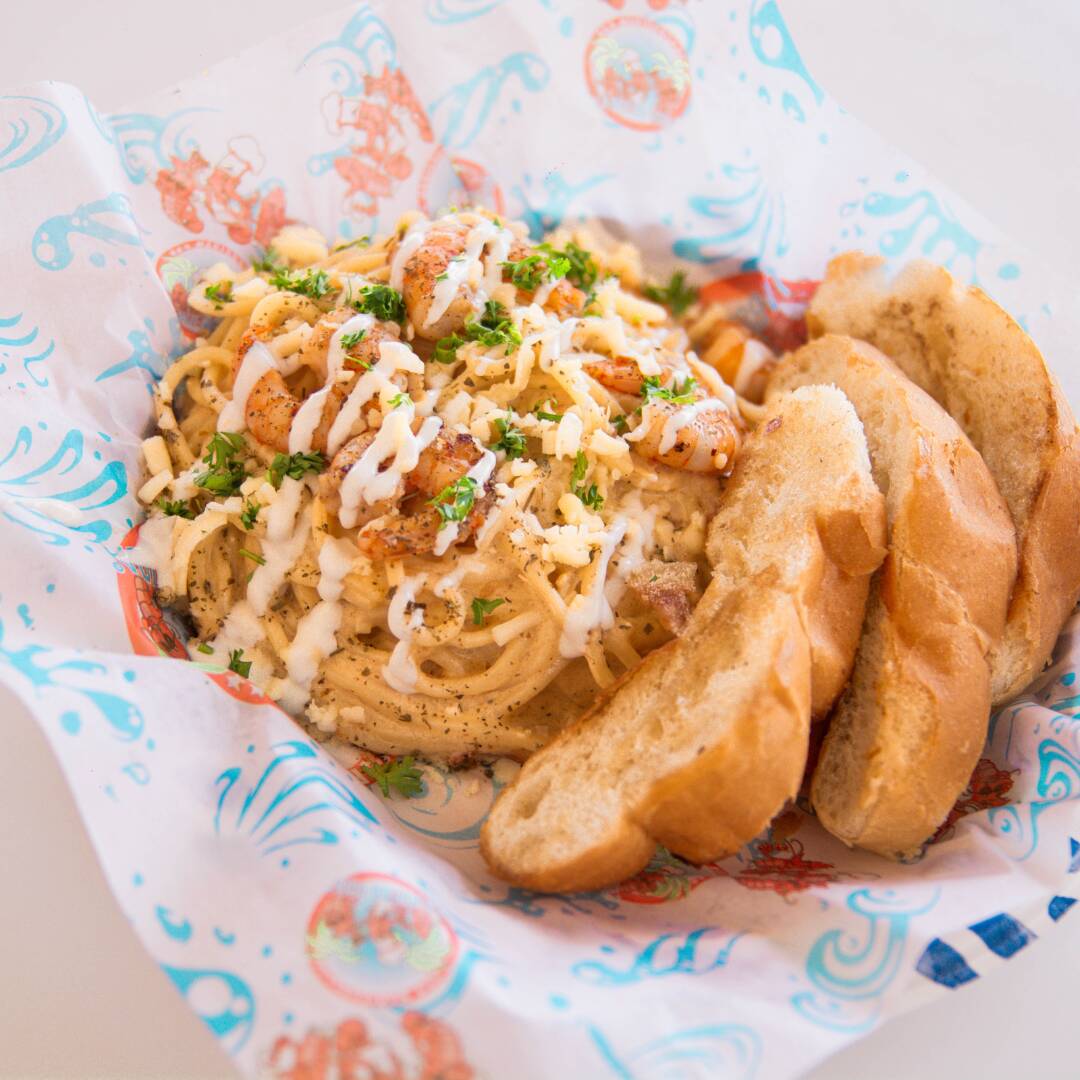 Espagueti en salsa Alfredo o Diabla, con camarones a la plancha, acompañado de pan con mantequilla y hierbas finas.