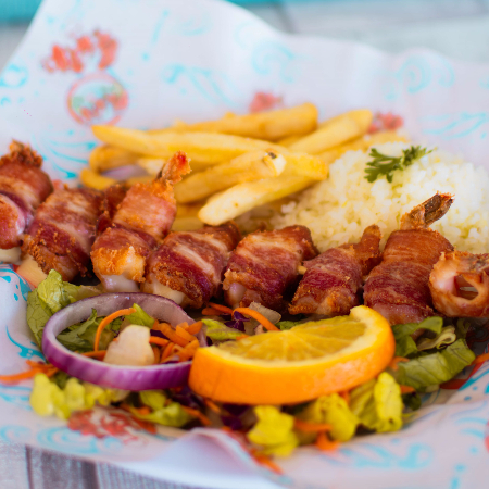 Los clásicos, 9 camarones rellenos de queso, envueltos en tocino, acompañados de arroz, papas francesas, ensalada y caldo de oso chico.