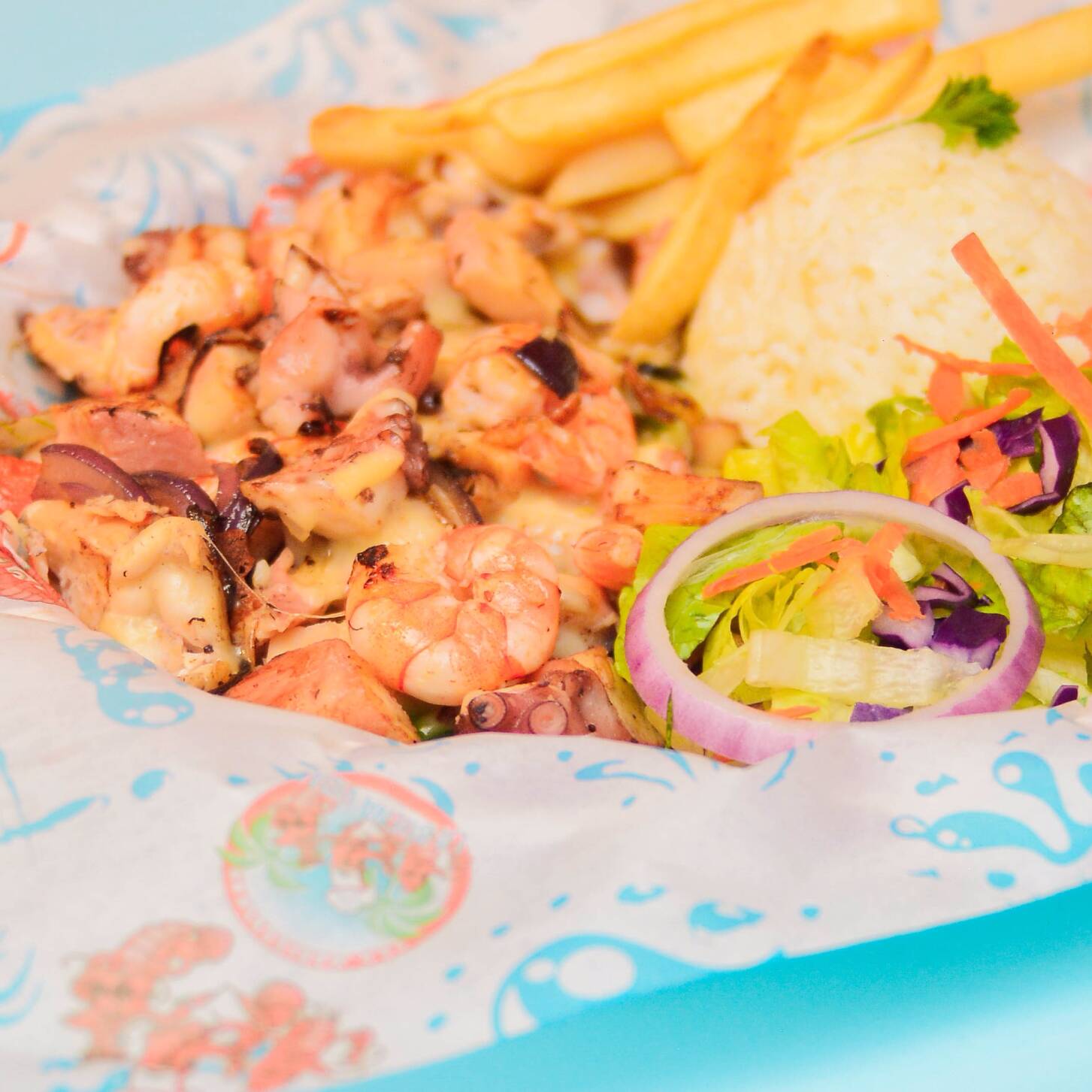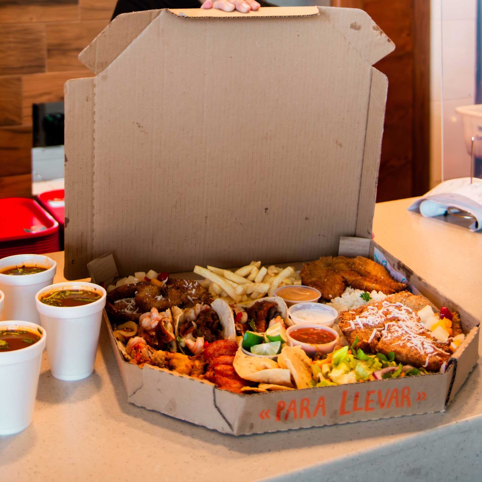 Ideal para compartir, 5 camarones enfiestados, 5 empanizados, 5 al coco, 1 filete empanizado, 1 al coco, 3 tacos mar y tierra, acompañados de arroz, ensalada, papas francesas, 4 caldos de oso chicos y 1 refresco de 2lt.