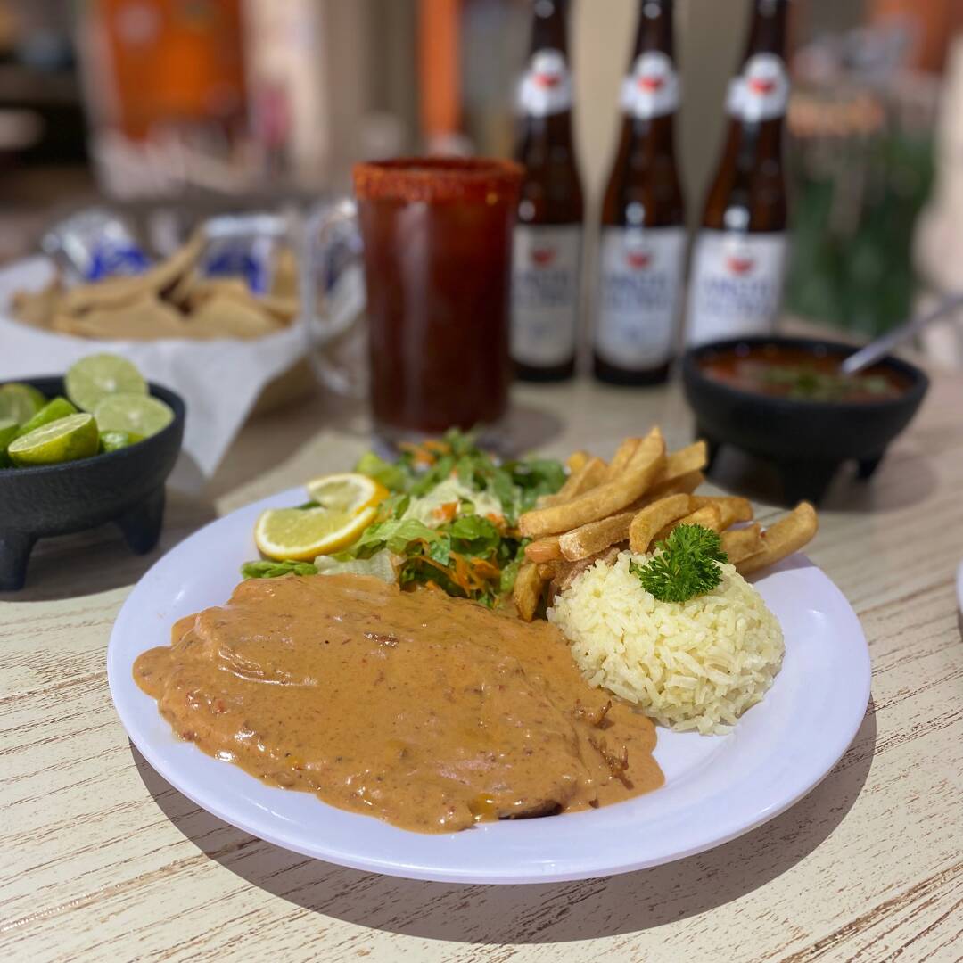 Delicioso filete a la plancha relleno de camarón o mariscos, bañado en salsa ranchera, acompañado de arroz, papas francesas, ensalada, y caldo de oso chico.