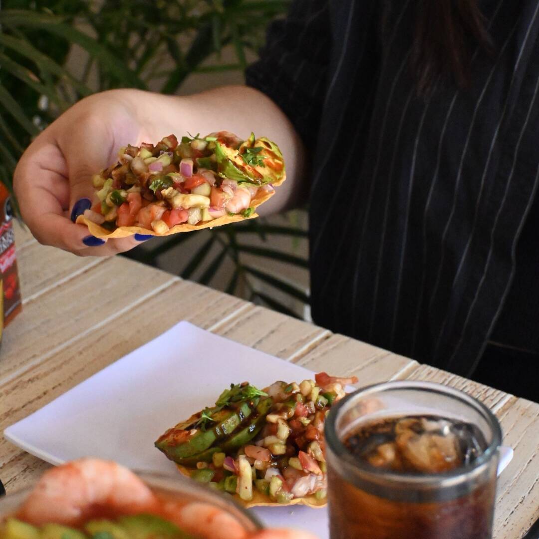 Cama de tostitos morados o verdes, con ceviche a tu elección, pepino, tomate, cebolla morada, aguacate y salsas negras.