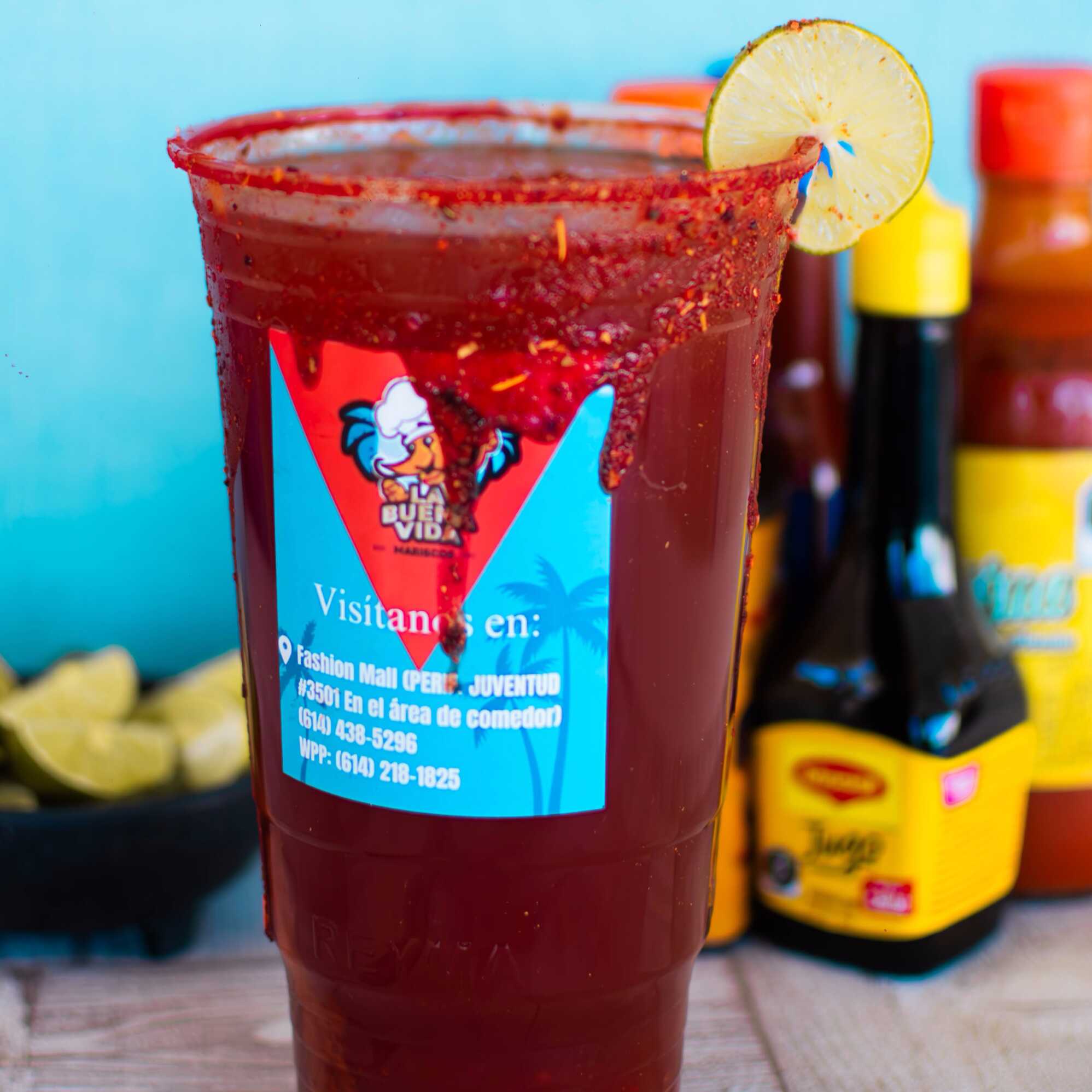 1lt de Clamato preparado con salsas negras, escarchado con Tajín, con una brocheta de 5 camarones.