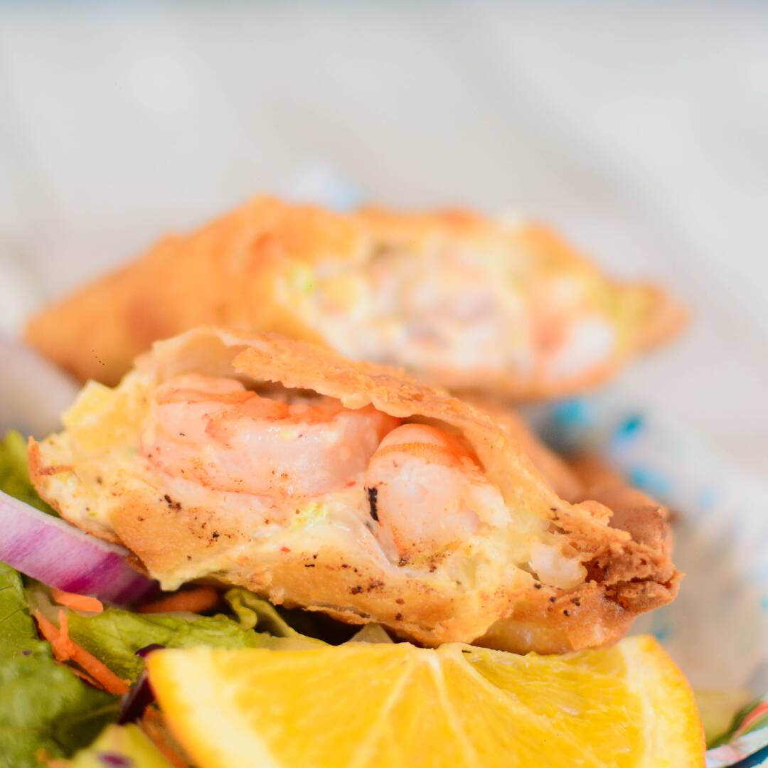 Doradita empanada rellena de camarón o mariscos y nuestro dip especial de queso crema, acompañada de aderezo chipotle.