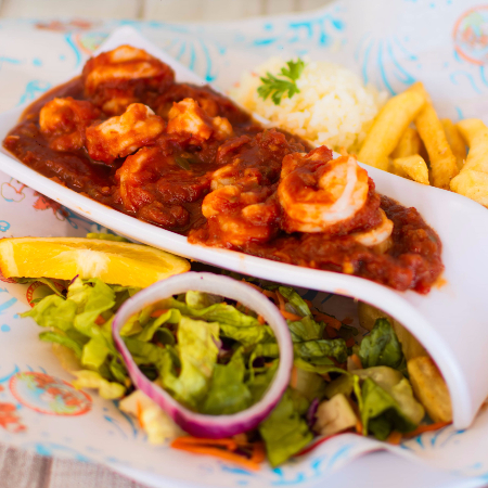 Camarones bañados en nuestra salsa diabla, acompañados de arroz, papas francesas, ensalada y caldo de oso chico.