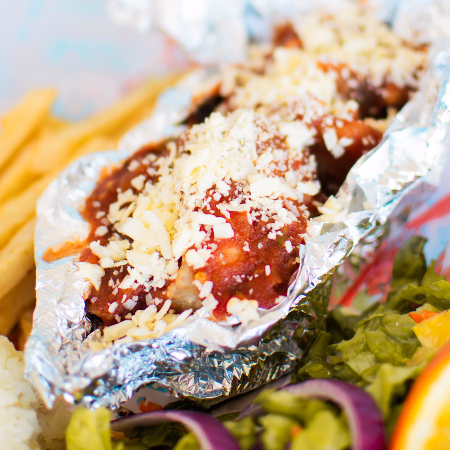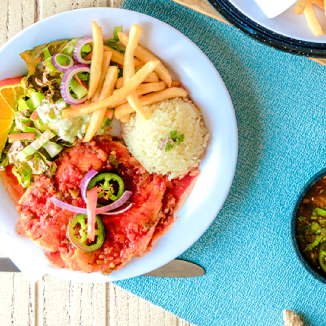 2 piezas de filete empanizado, relleno de camarón, bañado en salsa ranchera, acompañado de arroz, papas francesas, ensalada, y caldo de oso chico.