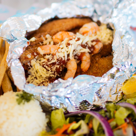 Una de nuestras especialidades, mezcla de calamar, pulpo, camarón, pescado y chile morrón puede ser gratinada, al mojo de ajo, mixta o al natural, acompañada de papas francesas, arroz, ensalada y caldo de cortesía.
