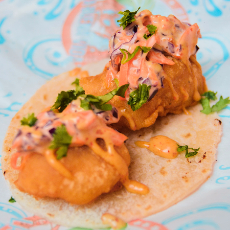 Pieza de taco capeado de pescado o camarón, con una ensalada de col morada, zanahoria, cilantro y aderezo encima. *En la compra de 3 tacos o más, te incluimos papas francesas y un caldo de cortesía*