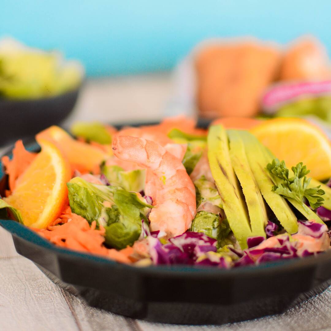 Ensalada de camarón, aderezo lechuga orejona, zanahoria, col morada, tomate, pepino y aguacate.
