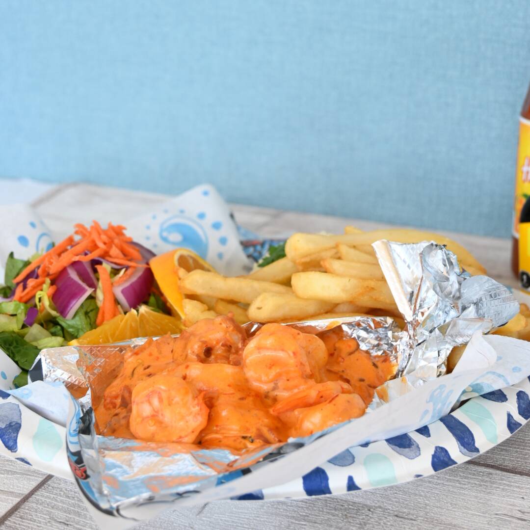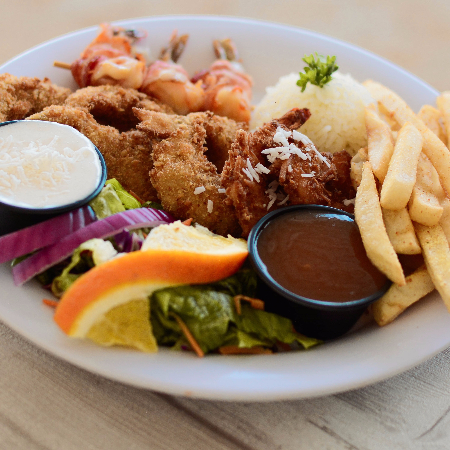 7 camarones empanizados al coco, acompañados de arroz, papas francesas, ensalada, aderezo calahua, mango habanero y caldo de oso chico.