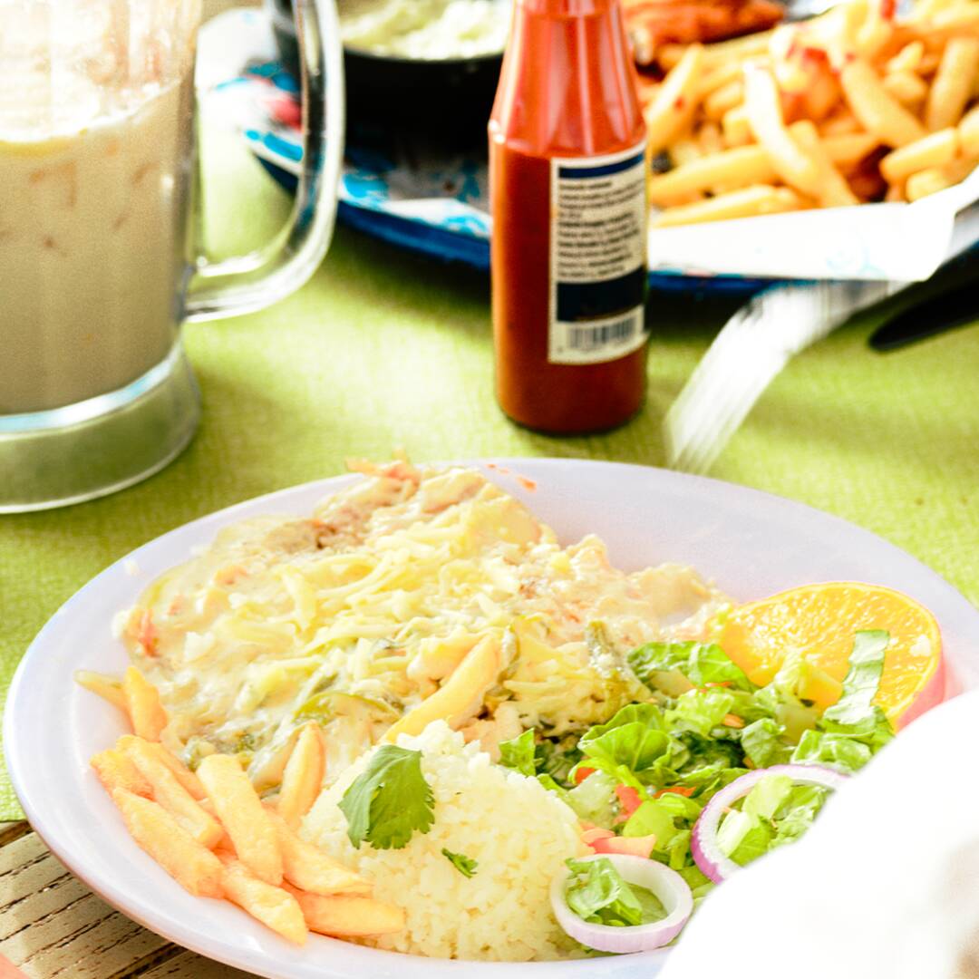 Delicioso filete a la plancha, bañado en nuestra salsa de queso, acompañado de arroz, papas francesas, ensalada y caldo de oso chico.