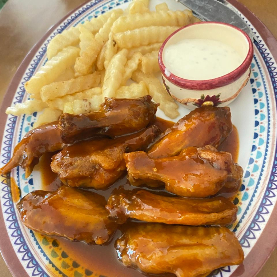 Alitas en Salsa BBQ con Papas*1 + Rollo de Sushi de Camarón*1 + Coca Cola*2