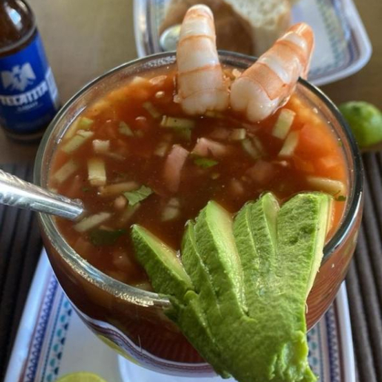 Camaron, pepino, tomate, apio y aguacate