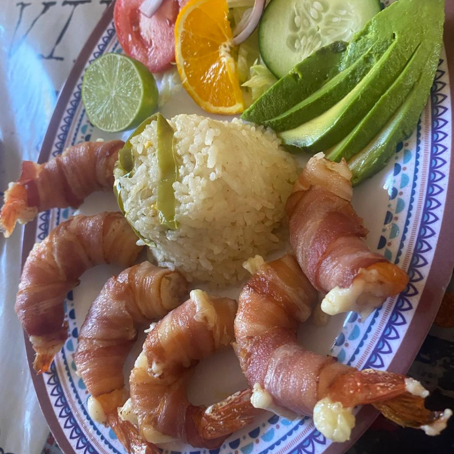 Camarones rellenos de queso envueltos en tocino, acompañados de arroz y ensalada