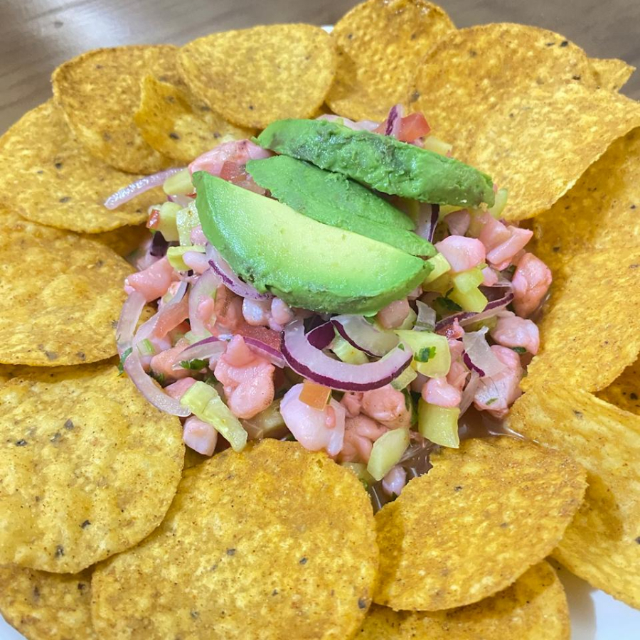Camaron cocido en limon, pepino, tomate, apio y aguacate