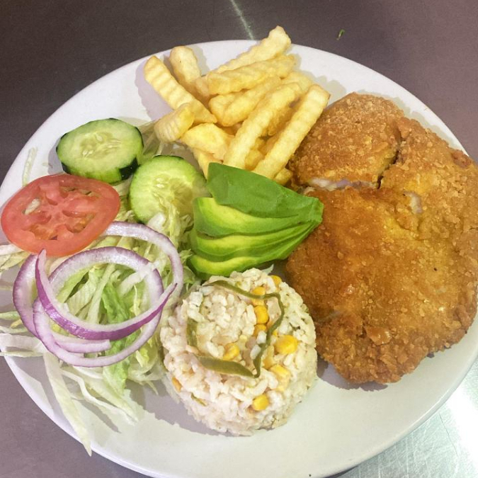 Filete empanzado acompañado de arroz blanco y ensalada