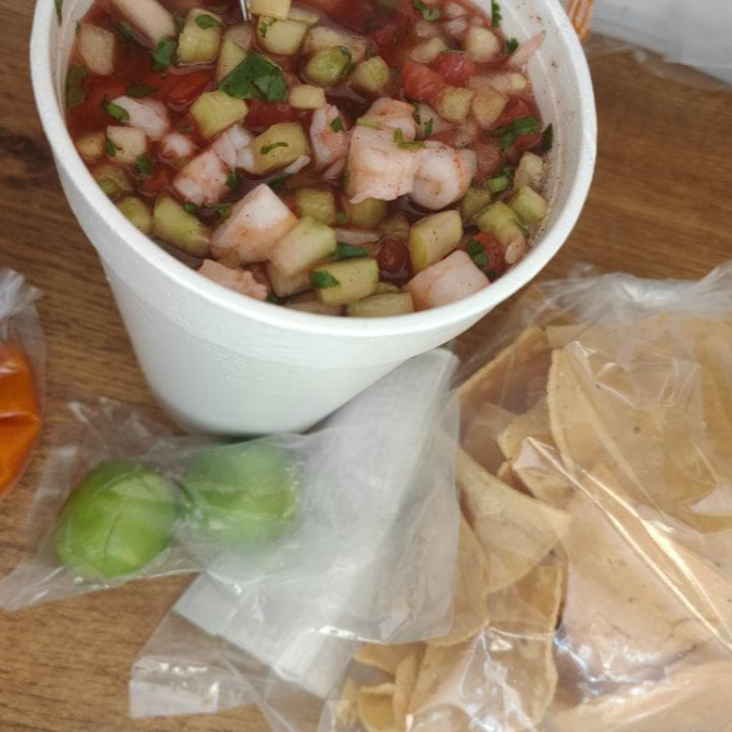 Tostitos a elegir con ceviche de camarón cocido en agua, incluye limón, bolsita de kermato preparado y salsas a elegir aparte.