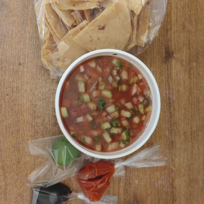 1 litro de aguachile de camarón (pepino, cebolla morada), picor de chiltepín a elegir, salsas aparte para agregar al gusto, incluye totopos y limón.