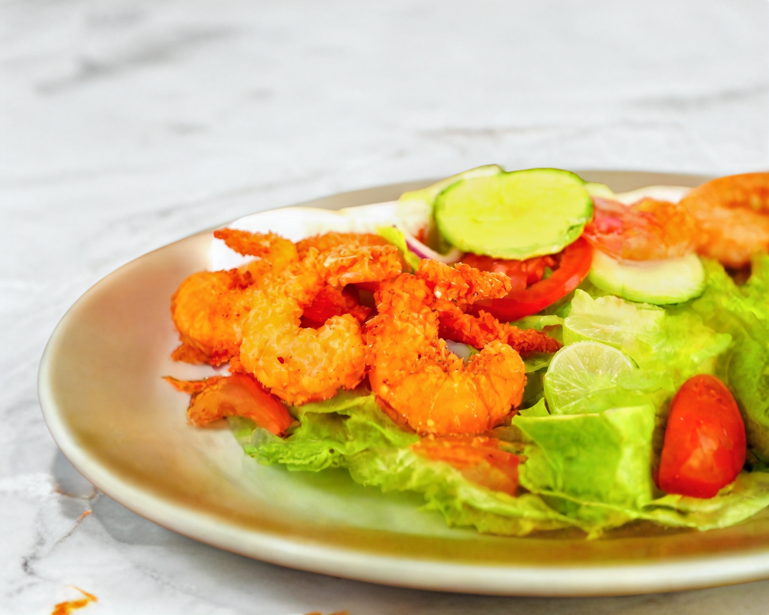 Ensalada de camarón cremosa con tomate pepino y lechuga